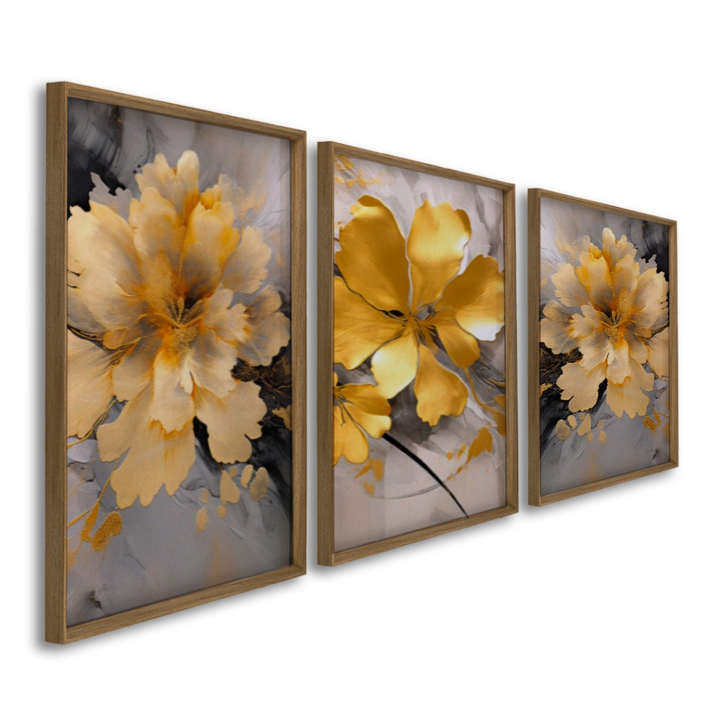 Quadro Decorativo Jardim de Outono Três Painéis em Harmonia Dimensões : 50x75 ou 60x90 Opções : Com Vidro ou Sem Vidro Esses três quadros apresentam uma composição rica de flores estilizadas em tons de outono. Os quadros r exibem flores predominantemente em laranja e amarelo, enquanto o quadro central foca em uma flor maior e mais detalhada, destacando-se contra o fundo cinza. O quadro inferior complementa a série com flores densas e volumosas, utilizando tons de marrom e laranja para criar um efeito de continuidade e harmonia entre os painéis. A combinação das cores quentes das flores com o fundo neutro reforça a sensação de um jardim em plena transformação outonal, evocando um equilíbrio visual e uma beleza serena. Material da Imagem: Papel fotográfico premium. Material da Moldura: Madeira de reflorestamento revestida em preto. Dimensões: 60cm de largura e 90cm de comprimento. Acompanha: Suporte de serrilha Acabamento: Fita kraft. Destaques: Design atemporal, alta qualidade de imagem e moldura, certificado FSC de manejo florestal Material da Imagem: Papel fotográfico premium. Material da Moldura: Madeira de reflorestamento revestida em preto. Dimensões: 50cm de largura e 75cm de comprimento. Acompanha: Suporte de serrilha Acabamento: Fita kraft. Destaques: Design atemporal, alta qualidade de imagem e moldura, certificado FSC de manejo florestal