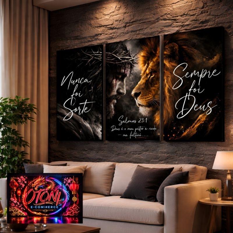 Quadro Decorativo Jesus e Leão De Judá Religioso Nunca Foi Sorte Sempre Foi Deus 3 Peças Grande 122x60