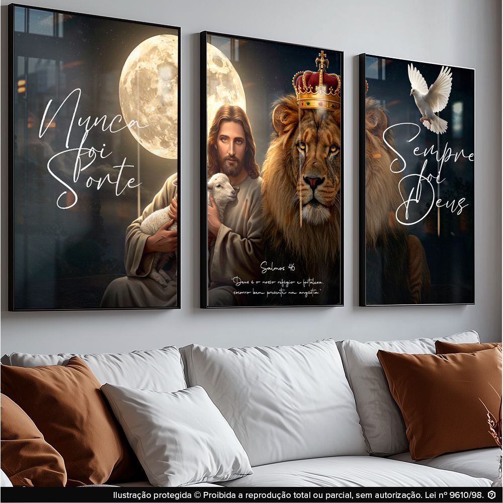 Quadro Decorativo Jesus Fé Leão Coroa Pomba Espírito Santo Propósito Divino Salmo 46