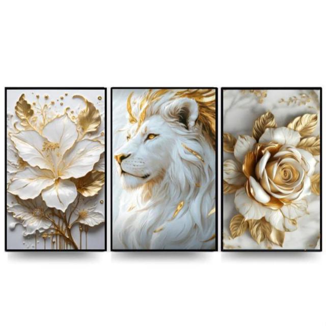 Quadro decorativo Leão tribo de judá jesus gold flor branco luxo 3 peças grande