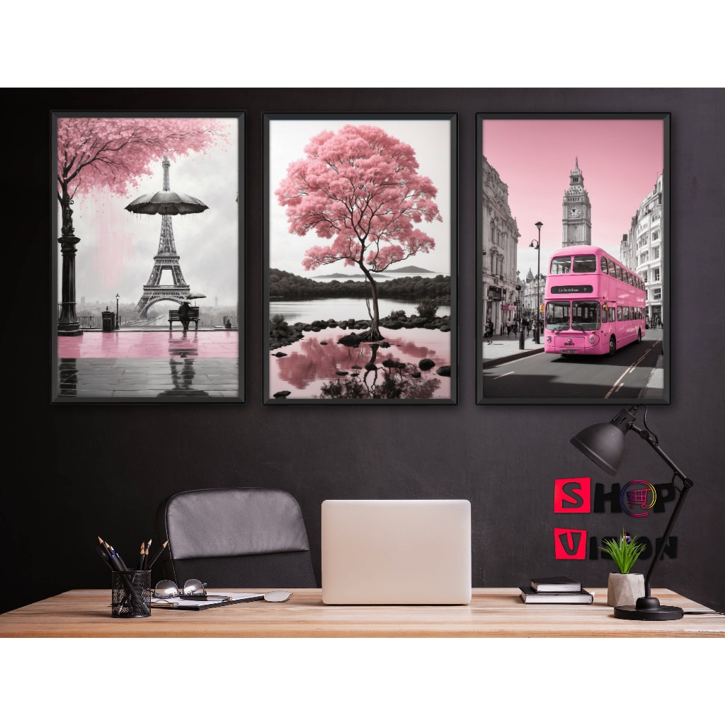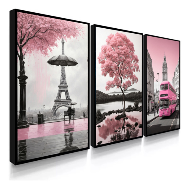 Quadro Decorativo Londres Árvore Da Vida Rosa Paris Torre Eiffel