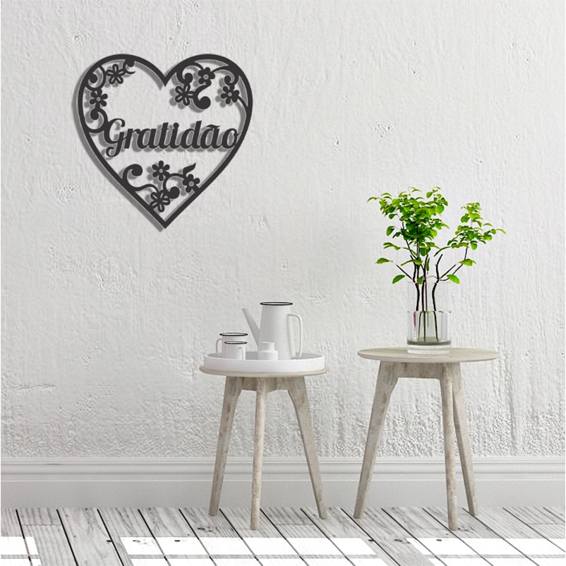 Quadro Decorativo MDF Coração com palavra Gratidão Preto Vazado