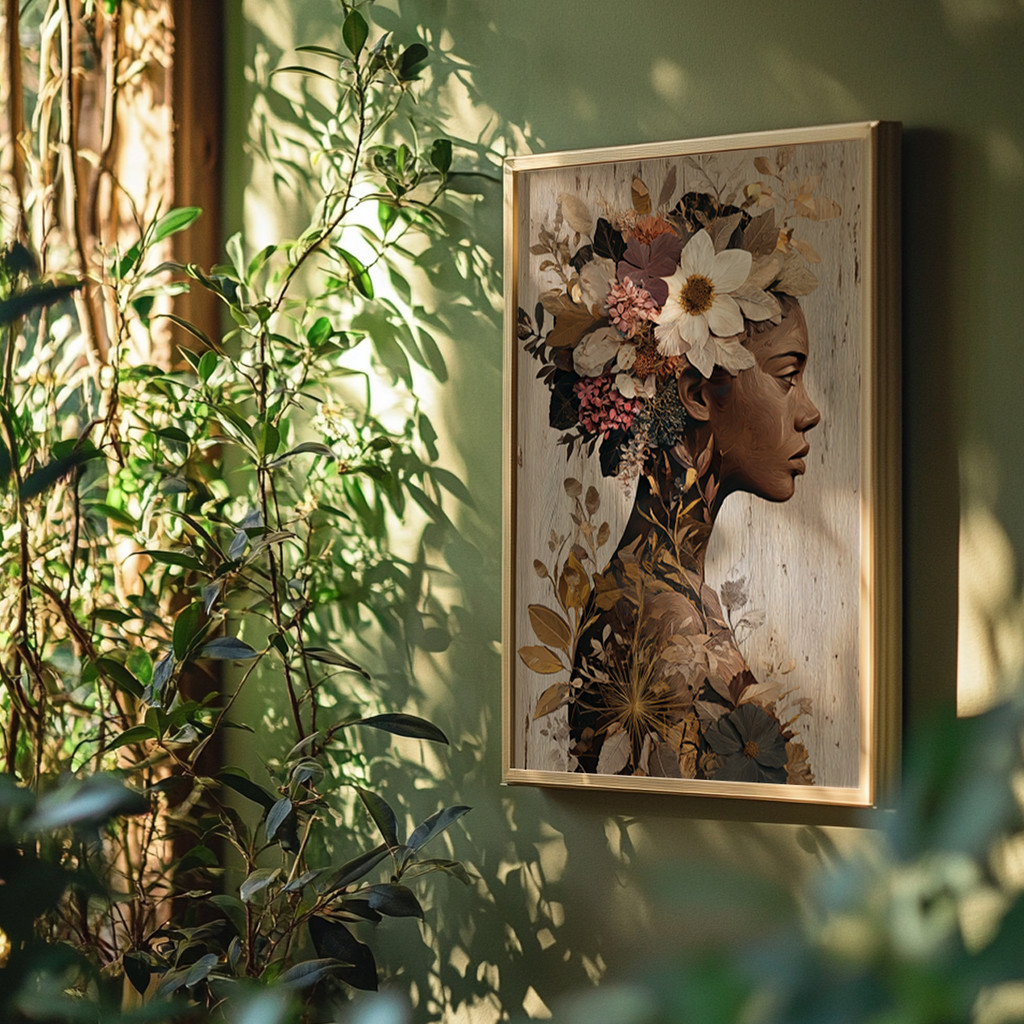 Quadro Decorativo Mulher Flores Perfil Afro Arte Natural Tons Terrosos Beleza Elegância