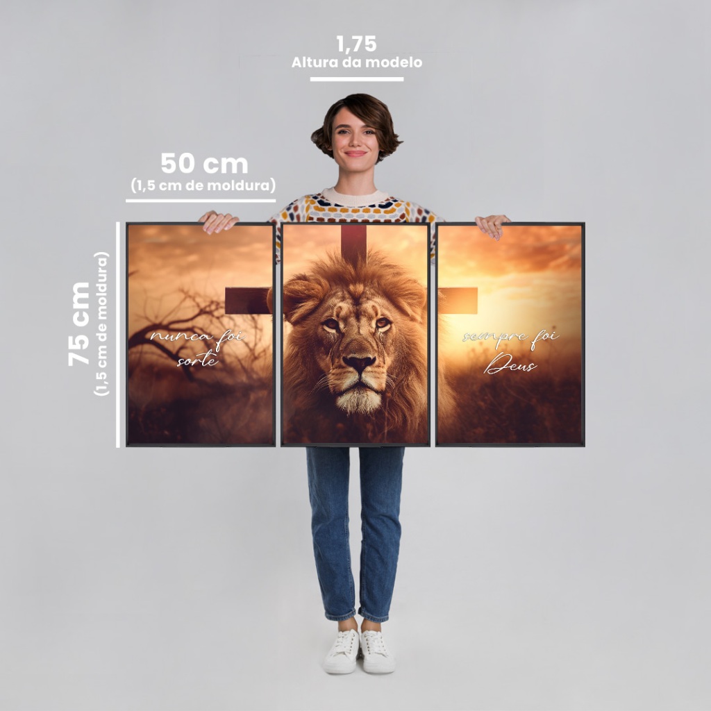 Quadro Decorativo Nunca Foi Sorte Sempre Foi Deus / Leao De Juda 3 Telas Sala Quarto Escritorio