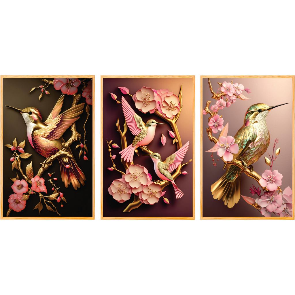 Quadro decorativo para salas e quarto beija-flor e cerejeira 3 peças (BEIJA FLOR MARROM)