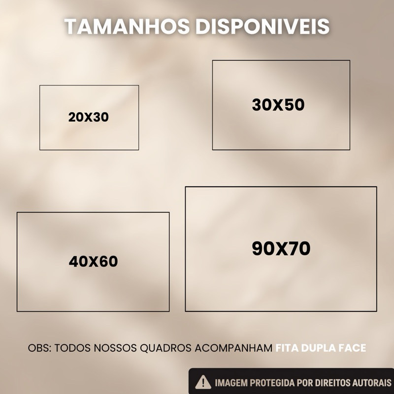 Imagens próprias em alta qualidade, únicos e exclusivos no mercado! Tela em Chassi De Madeira MDF (reflorestada, tratada e imunizada) Informações Técnicas: - O Quadro De Parede não precisa de moldura, pronto para pendurar na parede. - São feitos em adesivos vinil' de alta qualidade em impressão. - Não é necessário furar a parede para instalação, pois, enviamos fitas com grande poder adesivo para melhor instalação. - É necessário na hora da instalação posicionar o Quadro De Parede em 0,5 cm de largura entre eles para melhor qualidade de visualização. Medidas: •20x30cm •50x30cm •40x60cm •90x70cm Cuidados: - Limpeza: Utilizar Pano Seco ou espanador. - Utilizar em ambientes internos. - Não exponha o produto em Parede com sinais de umidade ou sob luz direta do sol, pois estes são prejudiciais a longevidade dele. - Não coloque peso sobre o produto ou empilhe, isto poderá deformar sua tela. Trabalhamos com diversos temas, temos todos em nossa loja! Dentre eles: Minimalista, Abstrato, Geométrico, Bauhaus, Nórdico, Boho, Pinturas, Desenhos, Leão Judá, Contemporâneo, Paisagens, Florais, Luxury, Coloridos, Religiosos...) QUALQUER DÚVIDA SOBRE O PRODUTO CONTATE NOSSA EQUIPE, IREMOS ATENDÊ-LOS DA MELHOR MANEIRA POSSÍVEL E TIRAREMOS TODAS SUAS DÚVIDAS!!