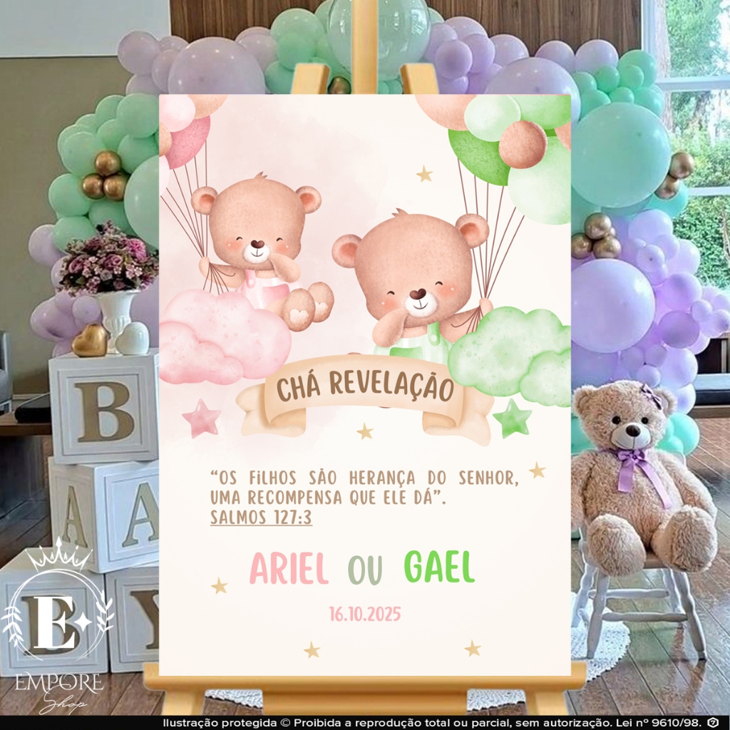 Quadro Decorativo Placa Chá Revelação Ursinhos Balão Menino ou Menina Personalizado