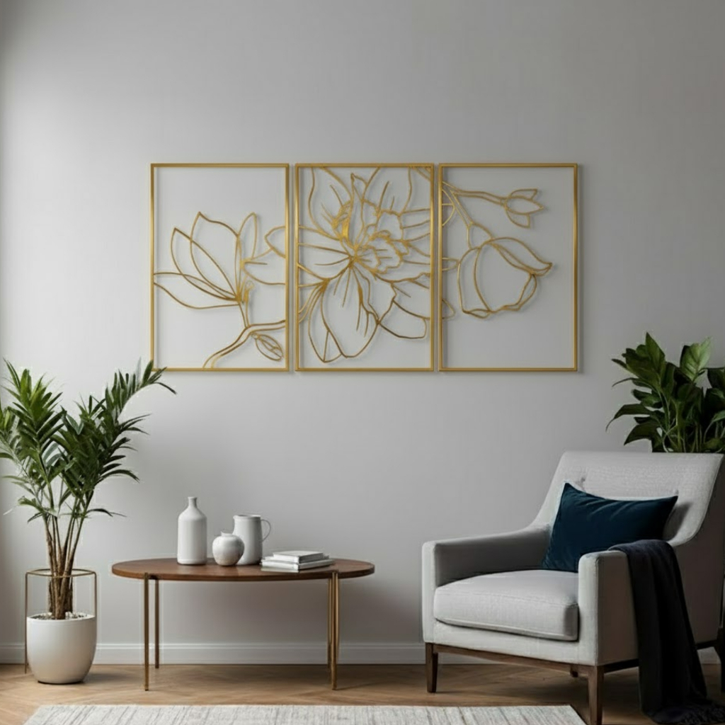 Quadro Decorativo Triplo Floral Minimalista em MDF – Parede Sala ou Quarto