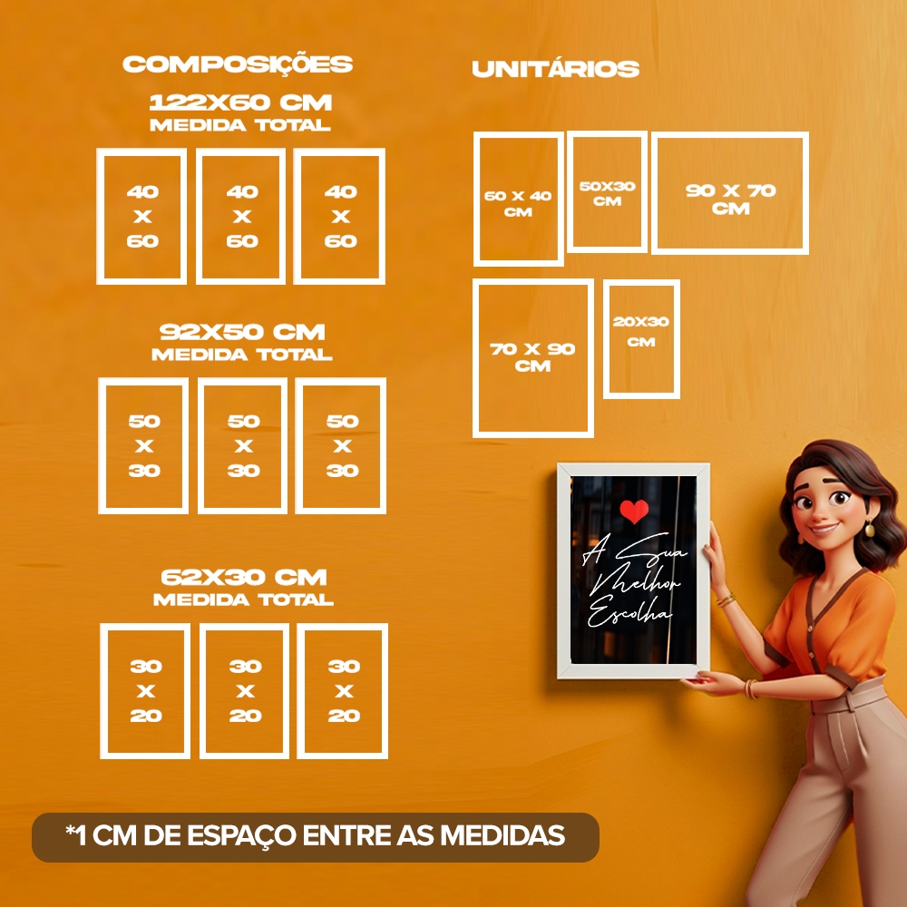 Trabalhamos com as seguintes medidas: (SELECIONE NO ATO DA COMPRA) 20x30 CM (20A x 30L) 30x50 CM (30A x 50L) 40x60 CM (40A x 60L) 60x80 CM (60A x 80L) Informações técnicas: - O quadro de parede não precisa de moldura, pronto para pendurar na parede. - São feitos em adesivos vinil de alta qualidade em impressão. - Não é necessário furar a parede para instalação, pois, enviamos fitas com grande poder adesivo para melhor instalação. - É necessário na hora da instalação posicionar o quadro de parede em 1cm de largura entre eles para melhor qualidade de visualização. Cuidados: - Limpeza: utilizar pano seco ou espanador. - Utilizar em ambientes internos. - Não exponha o produto em parede com sinais de umidade ou sob luz direta do sol, pois estes são prejudiciais a longevidade do mesmo. - Não coloque peso sobre o produto ou empilhe, isto poderá deformar sua tela. QUALQUER DÚVIDA SOBRE O PRODUTO ENTRE EM CONTATO PELO CHAT, NOSSA EQUIPE IRÁ ATENDELO(A) O MAIS RÁPIDO POSSÍVEL !