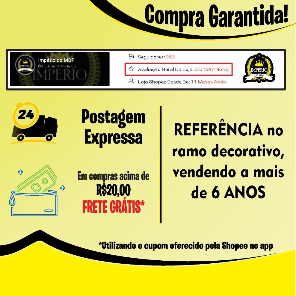 🌟 Império do MDF - Transformando Ambientes com Arte em MDF! 🌟 Seja bem-vindo ao universo encantador, onde a arte encontra a excelência em cada detalhe de nossos produtos em MDF. Somos uma empresa dedicada a proporcionar satisfação máxima aos nossos clientes, oferecendo uma linha exclusiva de peças que se destacam pela qualidade e originalidade. 🎨 Decoração Personalizada para Todas as Idades: Explore nossa diversificação em produtos. Acreditamos que a arte pode ser apreciada por todas as idades, tornando cada peça uma experiência única para crianças, jovens e adultos. 📦 Medida dos produtos: Frase 1: (P) - 20 x 10 cm Frase 2: (M) - 28 x 15 cm Frase 3: (G) - 42 x 20 cm ✨ Qualidade que Você Pode Confiar: Comprometidos com a excelência, nossos produtos em MDF são cuidadosamente confeccionados para garantir durabilidade e sofisticação. Acreditamos que cada peça é uma expressão artística, e isso reflete em nosso padrão de qualidade que busca superar as expectativas de nossos clientes. - Material: Madeira MDF 3mm Premium; - Cortada a laser; - Antialérgico e atóxico; - Produto não acompanha moldura. 📝Modo de uso: - Para limpar, utilize um pano úmido com água (apenas água), para maior conservação e durabilidade do seu produto; - Evite utilizar produtos químicos na limpeza. 📝Instalação do produto: - A instalação é super simples: os quadros já chegam na sua casa com uma fita dupla face para que você possa apenas retirar o lacre e instalar em qualquer superfície; - Certifique-se de retirar todo pó e/ou sujeiras possíveis entre a fita dupla face e a superfície para garantir uma boa fixação. 🚚 Entrega Rápida e Confiável: Sabemos que a ansiedade de receber seu produto é grande, por isso, garantimos uma entrega rápida e segura. Não só valorizamos a qualidade dos nossos produtos, mas também a experiência do cliente desde o pedido até a entrega. - Enviamos para todo Brasil; - Selo de Loja 100% honesta; - Produto com garantia; - Suporte via chat; - Em caso de qualquer dano ou quebra no transporte enviamos novamente, sem nenhum custo adicional, para garantir a sua satisfação. 💖 Sua Satisfação é Nosso Compromisso: A satisfação do cliente é nossa prioridade. Cada peça é criada com amor e dedicação, visando não apenas decorar, mas também encantar. Estamos aqui para tornar seus espaços mais especiais e memoráveis. Império do MDF, feito de coração ♥