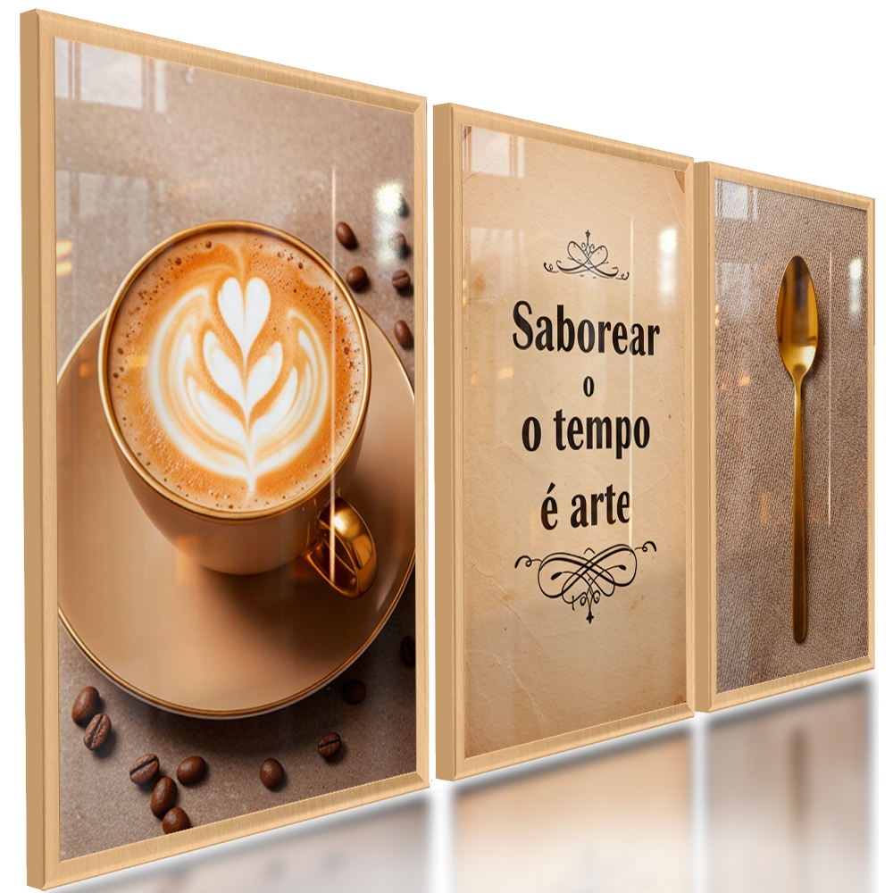 Quadro Decorativos Trio Café Xícara Amor Frase Moderno para Cafeteria Área Gourmet Cozinha