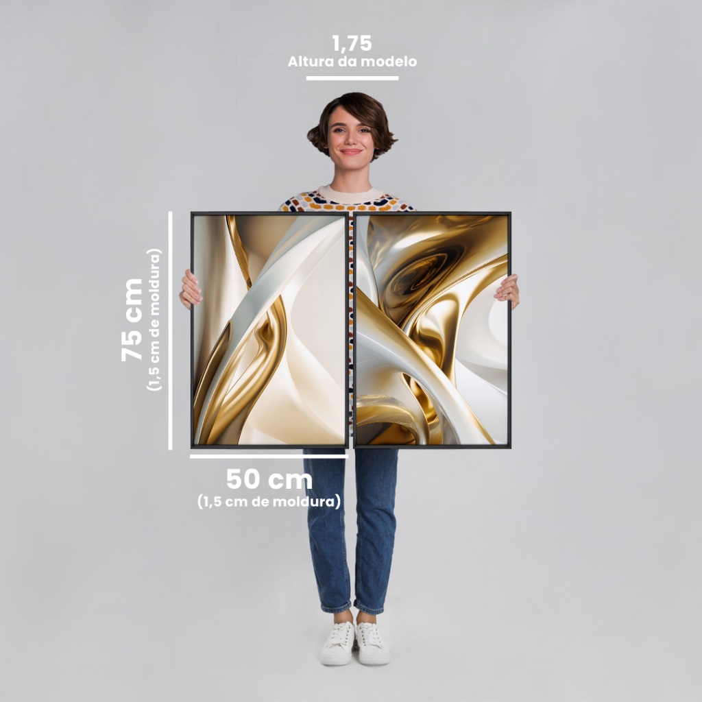 Quadro Elegância Abstrata em Dourado 2 Telas Moldura Branca 50x75 O quadro tem uma composição fluida e curvilínea com tons de dourado, branco e bege, que transmite uma sensação de movimento suave e sofisticação Material da Imagem: Papel fotográfico premium. Material da Moldura: Madeira de reflorestamento revestida em preto. Dimensões: 50cm de largura e 75cm de comprimento. Acompanha: Suporte de serrilha Acabamento: Fita kraft. Destaques: Design atemporal, alta qualidade de imagem e moldura, certificado FSC de manejo florestal,