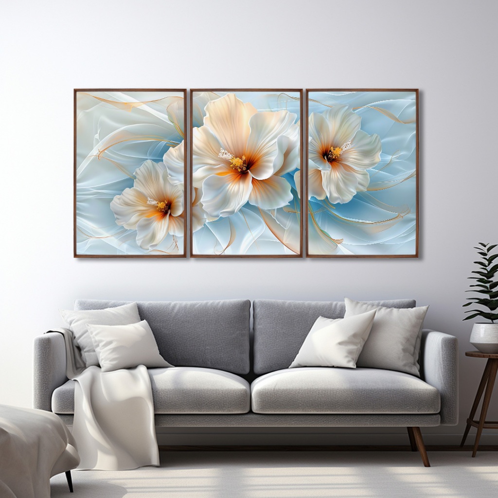 Quadro Florescer da Tranquilidade 3 Telas Moldura Branca Preta Madeira e Tabaco Para Quarta Sala