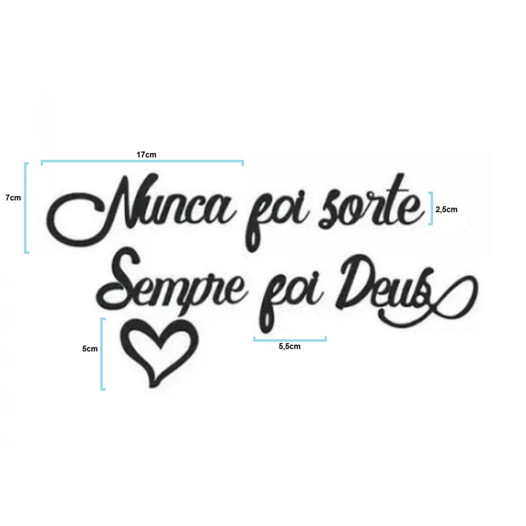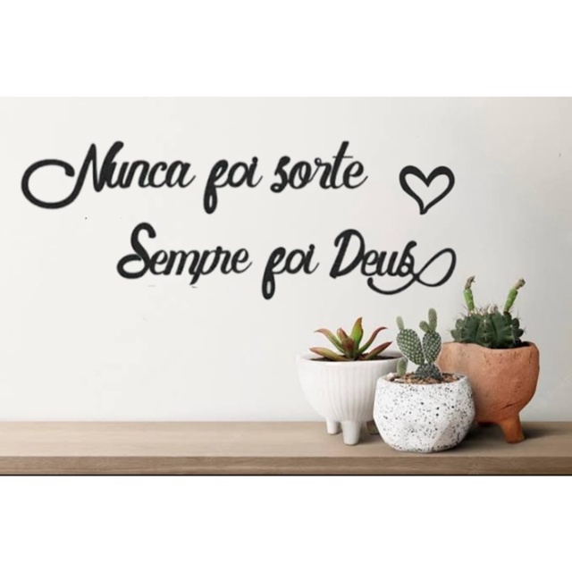 Olá, Seja muito bem vindo(a) a Lar Mais Decor. A frase decorativa '' Nunca foi sorte sempre foi Deus'' é uma excelente opção para decorar qualquer ambiente do seu lar, com muita beleza, estilo e com muita economia, além de ser muito prático de aplicar, sem sujeira ou furo na parede, pois o produto é fixado na parede com uma fita dupla face enviada junto com o produto. O produto é produzido em MDF com espessura de 3mm na cor Preto Fosco. INFORMAÇÕES DO PRODUTO: - Modelo: Frase '' Nunca foi sorte sempre foi Deus''. - Medidas das letras varia de: 17x7cm (Largura x Altura) palavra maior "Nunca" 5,5x6cm (Largura x Altura) da palavra menor "Foi". A medida completa da frase depende da montagem na parede (espaço entre as palavras). - Material: MDF - Espessura: 3mm - Acabamento: Preto Fosco. - Produzidos com corte à laser com o fundo vazado. * OBSERVAÇÃO: Não possui moldura, as palavras são soltas para serem coladas(com cola dupla face) na parede conforme a preferência do comprador. INSTALAÇÃO: As palavras serão fixadas com uma fita dupla face que será enviada junto ao seu produto. O produto só deve ser aplicado em superfícies que sejam totalmente lisas e foscas, sem nenhum indício de textura, irregularidades ou brilho. Caso queira aplicar em superfícies com textura ou brilho, será necessário utilizar pregos pequenos para pendurar o produto. LIMPEZA: A limpeza pode ser realizada com um pano úmido, não recomendamos que utilize produtos abrasivos.