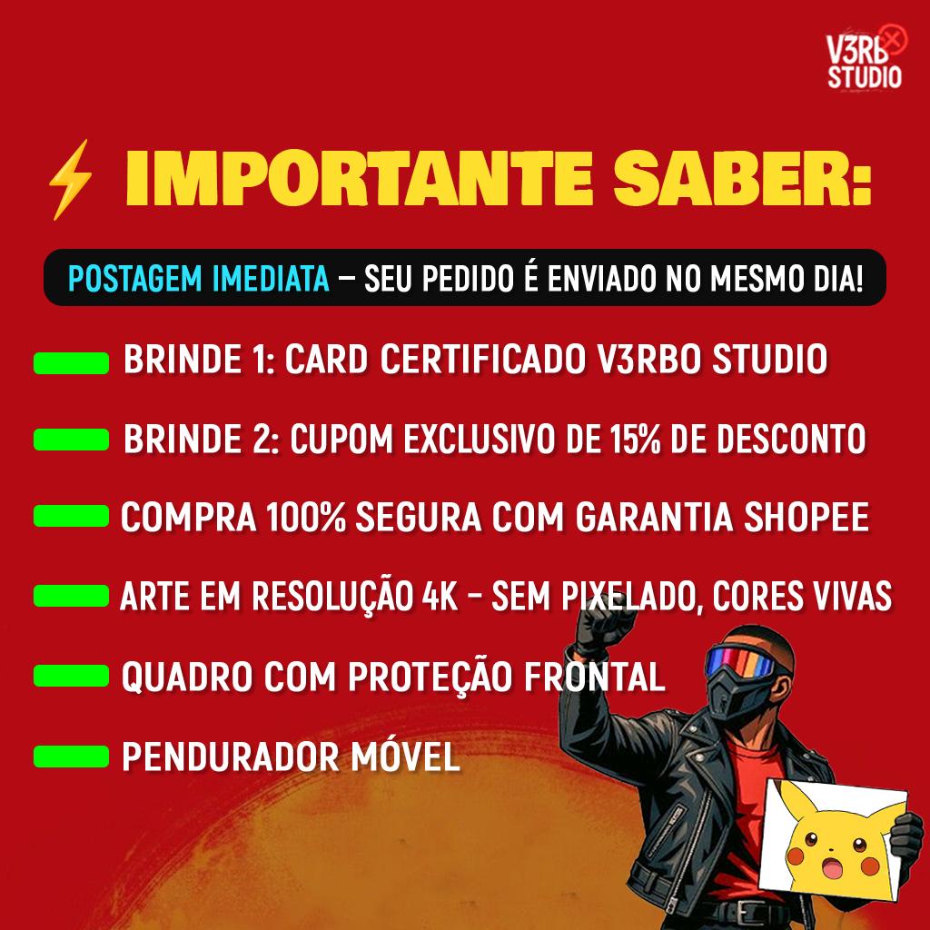 ✅ Envio no mesmo dia (para pedidos confirmados até o horário limite). Pedido 100% monitorado pela Shopee – segurança e rastreio em tempo real. Brindes exclusivos em todos os pedidos: • Card certificado (edições Divine, Radiant ou Challenger) • CUPOM 15% DE DESCONTO para próxima compra • Embalagem blindada e à prova de danos – seu quadro chega intacto, garantido Destaques que fazem diferença: ✅ Impressão 4K de alta definição (nada de imagem pixelada!) ✅ Moldura preta minimalista em madeira reflorestada, acabamento ecológico ✅ Proteção frontal acetato cristal – leve, segura e sem risco de quebra ✅ Base premium, garantindo firmeza e acabamento perfeito. ✅ Pode ser usado na vertical ou horizontal APÓS 5 ANOS, CHEGAMOS AO ONLINE: Envios feitos direto do estúdio V3RBO, com inspeção antes de cada postagem. Tamanhos disponíveis: A4 (25x34 cm) | A3 (33x45 cm) V3RBO ARTE AUTÊNTICA V3RBO STUDIO #KimetsuNoYaiba #QuadroDemonSlayer #PosterDemonSlayer #ArteDemonSlayer #Tanjiro #Nezuko #Zenitsu #Inosuke #Kanao #GiyuTomiyoka #ShinobuKocho #Rengoku #Muichiro #UzuiTengen #QuadroAnime #PosterAnime #DecoraçãoOtaku #QuadroGeek #PosterGeek