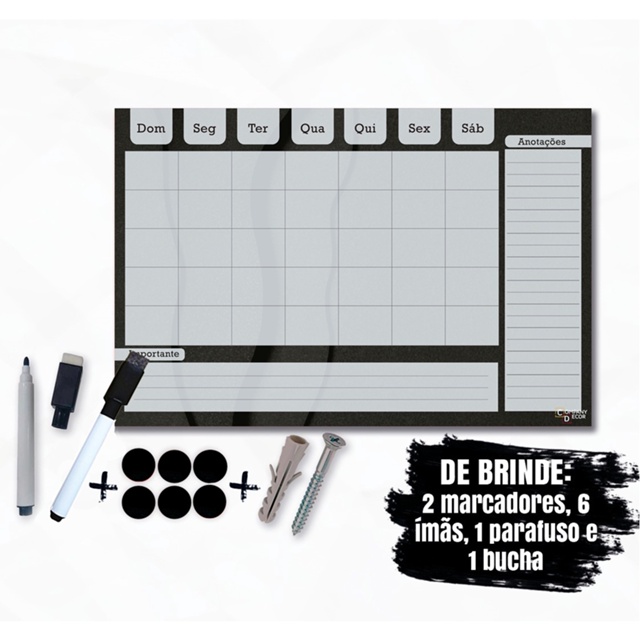 | Quadro Lousa Planner Office + 2 Canetas, 6 imãs, parafuso e bucha este produto | R$ 39,49 | — | 4.9/5 | 141 |