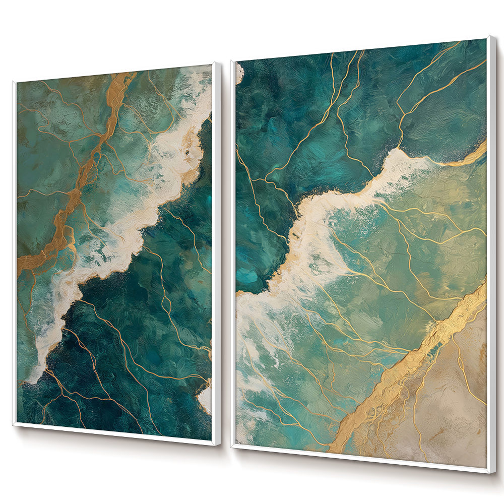 Quadro Moderno Abstrato Grande Kit 2 Quadros Decorativos Sala Com Moldura Quadro Dourado Mar Verde