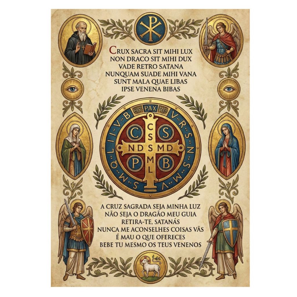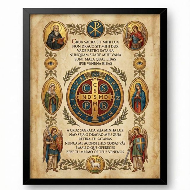 Quadro Decorativo Oração de São Bento: Proteção e Fé para o Seu Lar Por que ter a Oração de São Bento em casa? A Oração e a Medalha de São Bento são mundialmente reconhecidas como um dos mais poderosos sacramentais da Igreja. Ter esta oração exposta em seu lar não é apenas um ato de devoção, mas uma forma de clamar pela proteção divina constante. A cruz sagrada seja a minha luz (Crux Sacra Sit Mihi Lux). Esta oração é invocada há séculos para afastar o mal, trazer paz de espírito e abençoar o ambiente familiar. Ao colocar este quadro em sua parede, você une a beleza da decoração com a segurança de um lar abençoado, criando um refúgio de tranquilidade e fé para sua família e visitas. Qualidade que dura gerações Nossos produtos são desenvolvidos para durar. Trabalhamos com impressão em ultra definição, garantindo cores vivas e textos nítidos. Além da beleza, prezamos pela resistência: todas as peças contam com proteção especial contra desbotamento, água e sujeira. Facilidade no dia a dia: Pode limpar seu quadro com pano úmido sem medo! A proteção laminada garante que a imagem permaneça intacta. Oferecemos duas opções de acabamento para se adequar perfeitamente ao seu estilo: Opção 1: Quadros Moldurados (Elegância Clássica) Ideal para quem busca sofisticação e robustez. Acabamento Premium: Impressão em Papel Fotográfico Ultra com acabamento laminado fosco. Segurança e Leveza: A laminação especial dispensa o uso de vidro, evitando reflexos e riscos de quebra, mantendo a proteção da imagem. Moldura de Verdade: Feita em madeira pinus (disponível nas cores preta ou branca), garantindo estrutura e beleza. Versatilidade: Acompanha pendurador móvel, permitindo fixação tanto na vertical quanto na horizontal. Praticidade: Fundo com sistema FlexPoints, que facilita o manuseio ou troca da impressão caso deseje no futuro. Opção 2: Placas Decorativas (Modernidade e Praticidade) A solução perfeita para quem quer decorar rápido, sem furos na parede e com visual limpo. Material Resistente: Base em MDF tratado de 3mm com Papel Fotográfico Ultra. Proteção Total: Aplicação de película protetora sobre a impressão, blindando a arte contra desbotamento, água e poeira. Durabilidade Superior: Nos destacamos da concorrência pelo alto tempo de durabilidade e resistência do material. Limpeza Fácil: Pode usar pano úmido ou até mesmo limpa-telas para manter sua placa sempre nova. Instalação em Segundos: Acompanha fita Dupla-Face 3M (12mm) de alta aderência. Lema: Chegou, destacou, decorou! Leve hoje para sua casa a união perfeita entre a proteção espiritual de São Bento e a excelência em decoração.