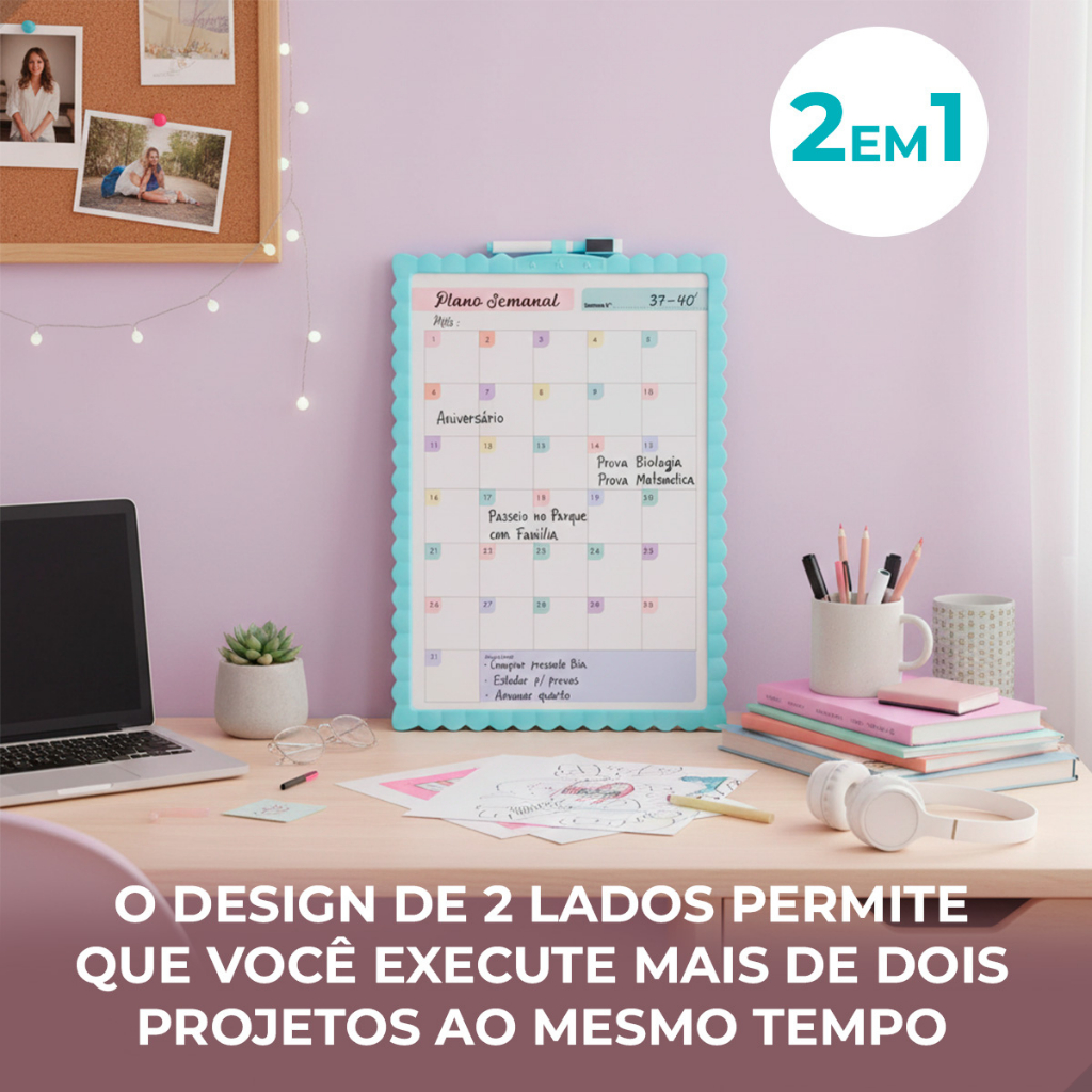 Quadro planner semanal ou mensal ideal para organizar a rotina com praticidade e cor. Possui moldura colorida que decora o ambiente, espaço para planejar tarefas, compromissos e metas, além de acompanhar caneta da mesma cor para escrever e apagar facilmente. Perfeito para estudos, trabalho ou uso em casa. -Quadro Planner com Moldura -Semanal ou Mensal -Magnético com Imãs Indicativos -Medidas: 39.5x28cm -Cores/Modelos: Azul, Amarelo, Rosa, Lilás -2 em 1 - Lado Branco para anotações