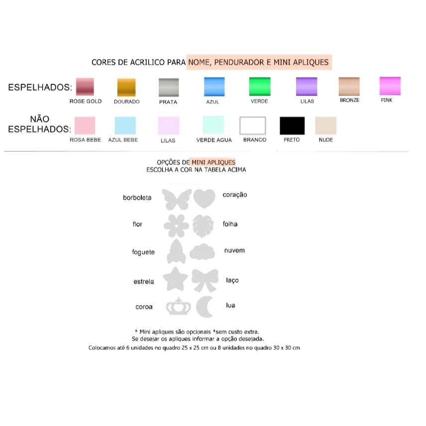Nossos produtos são destinados para quem procura QUALIDADE acima de tudo. Após a compra nos informe no CHAT: * A estampa escolhida. (Catálogo nas fotos do anúncio). * O nome que deseja colocar (até no máximo 3 nomes - simples ou 2 nomes compostos) * Se desejar apliques informar qual prefere (catálogo nas fotos do anúncio). Temos diversos apliques para escolha. Escolha um modelo e informe no chat. Enviamos uma prévia da arte para aprovação. Quadro em madeira na cor branca, sem vidro, com fundo estampa impressa com laminação em vinil (impermeável). Aplicamos uma película de super proteção para a estampa. Essa película facilita a limpeza e aumenta a durabilidade. A placa pode ser limpa utilizando um pano com álcool que não danifica a estampa. *** Não passar álcool nas peças em acrílico. Acompanha cordinha para pendurar no gancho da maternidade. Atrás do quadro tem também um suporte para pendurar o quadro no prego ou parafuso. **Caso prefira fixar o quadro com fita dupla face podemos substituir a cordinha e o suporte pela fita dupla face 3M. Neste caso é preciso solicitar esta alteração no chat. Tamanho do quadro: 25x25 cm ou 30x30 cm ATENÇÃO: O nosso prazo de produção e envio são de apenas 2 dias úteis após a confirmação da compra. Por isso é necessário que nos INFORME O NOME e a ESTAMPA no chat, IMEDIATAMENTE após a conclusão da compra, e a APROVAÇÃO DA ARTE também tem que ser bem rápida.