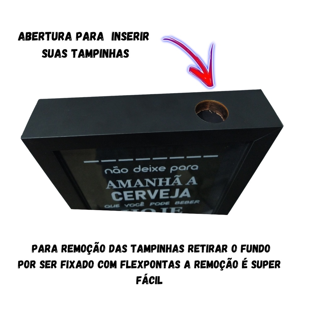 ======= Bem vindo ao nosso Anúncio :D ======= Quadro Porta Tampinhas Cerveja Moldura na cor Preta Nosso Quadro Cofre tem o tamanho de 20x30(cm) dimensão interna e uma profundadidade de 3cm para você juntar moedas ou notas para realizar aquele sonho A Dimensão externa do nossa Quadro conta com os tamanhos de 4,5cm de altura x 22cm de largura e 32cm de comprimento Nosso Quadro tem furo na parte superior para inserir tampinhas Quadro de madeira Pinus com acabamento Laminado na cor Preta de Alta Qualidade Quadro conta com adesivo na parte frontal de alta resistência Embalamos os produtos com materiais que garantam que o produto chegue até você com total segurança Fundo Removivel para retirada das tampinhas *** Caro Cliente garantimos a saida do produto em perfeitas condições de nosso estabelecimento, somos fabricantes em caso de qualquer problema ou avaria com o produto nos informar pelo chat que estaremos a disposição para resolver qualquer problema de maneira mais rapida e simples possivel. ***