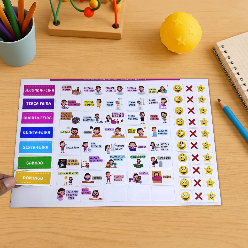 ( PRODUTO NÃO PERSONALIZADO ) Está cansado(a) de ter que repetir infinitas vezes o que seu filho precisa fazer no dia ? Atividades simples como ''tomar banho'' e ''escovar os dentes está sendo uma grande dificuldade para conseguir fazer com que a criança realize sem birras e brigas. Então você precisa aplicar o quadro '' Tarefas do dia '' com o seu filho e veja a transformação, a criança entenderá a necessidade de realizar as suas atividades diárias de forma lúdica e divertidade, sem estresses. O Quadro de rotina ajuda as crianças a se organizarem e desenvolverem sua autonomia, incentivando o cumprimento das tarefas. Os quadros de rotina e também os quadros de regras têm sido indicado por psicólogos para ajudarem os pais no processo de educação dos filhos. Informações do Produto DIMENSÕES: 40cm de largura x 30cm de altura. Dimensões ideais para conseguir uma boa visão das figuras que representam as rotinas. MATERIAIS: O quadro é feito em manta magnética adesivada em adesivo vinil impressão digital de alta qualidade. As tags de rotina ilustradas, são feitas em manta magnética adesivada, recortada eletrônicamente. ONDE E COMO FIXAR O QUADRO? O quadro deverá ser fixado na geladeira ou em alguma superfície metálica, não recomendamos a fixação na porta de geladeiras com detalhes, pois o quadro precisa estar totalmente fixado no metal para garantir a sua fixação e a fixação das tags. Não fixar na parede, pois compromete a fixação das tags. • Acompanha as seguintes tags imantadas: • Arrumar a cama • Escovar os dentes (3x) • Trocar de roupa • Lição de casa • Calçar os sapatos • Pentear o cabelo • Tomar banho (2x) • Lavar as mãos • Colocar a roupa suja no cesto • Tarefas domésticas • Guardar os brinquedos • Vestir uniforme • Comer frutas • Almoçar • Jantar • Café da manhã • Fazer as orações • Tomar água • Dar descarga • Pendurar a toalha • Leitura • Levar o prato na pia • Guardar as roupas • Guardar os sapatos • Preparar sua mochila • Cuidar do pet • Regar as plantas • Estudar • Vestir o pijama • Brincar • Soneca • Fazer xixi e cocô no vaso • 3 tags em branco NOSSOS DIFERENCIAIS: As tarefas são escritas em caixa alta facilitam a leitura da criança que está em fase de alfabetização, cada tarefa possui uma ilustração para tornar o quadro mais didático e de forma que a criança entenda o que se trata na regra mesmo que ela ainda não saiba ler. * Impressão em adesivo vinílico que NÃO DESBOTA. Pode ser limpo com pano úmido. * Material e acabamento de qualidade. Embalado cuidadosamente para chegar em bom estado até você. * Garantia de entrega ou dinheiro de volta. CUIDADOS: - O quadro não é um brinquedo. Considere-o um aliado DOS PAIS e UM MÉTODO para auxiliar na educação do filho. - Por conter peças pequenas, recomendamos a supervisão dos pais. - A limpeza pode ser feita com pano úmido. - Evite movimentar o quadro enquanto estiver sendo usado, pois as TAGs poderão cair facilmente. - Não dobre o quadro imantado, pois irá quebrá-lo. - Não usar produtos abrasivos e químicos para a limpeza do quadro e tags.