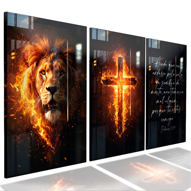 Quadros Decorativo 3 Sala Quarto Peças Leão Judá Cruz Chamas Salmo