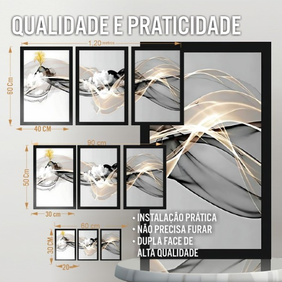 Kit contendo 3 Peças (COM ESPAÇAMENTO ENTRE AS PEÇAS DE 2cm) - 3 Tela (Altura x Largura):60x40cm - 3 Tela (Altura x Largura): 50x30cm - 3 Tela (Altura x Largura): 20x30cm Informações Técnicas: - O quadro não precisa de moldura, pronto para pendurar na parede. - São feitos em adesivos de alta qualidade em impressão. – Não é necessário furar a parede para instalação, pois, enviamos fitas com grande poder adesivo para melhor instalação. - É necessário na hora da instalação posicionar o quadro em 02 cm de largura entre eles para melhor qualidade de visualização. - Dimensão Real de Cada Quadro. OBS: (SELECIONAR NA VARIAÇÃO O TAMANHO DA PLACA) CUIDADOS: - Limpeza: Utilizar Pano Seco ou espanador. - Utilizar em ambientes internos. - Não exponha o produto em paredes com sinais de umidade ou sob luz direta do sol, pois estes são prejudiciais a longevidade do mesmo. - Não coloque peso sobre o produto ou empilhe, isto poderá deformar sua tela. Dúvidas Frequentes: - Reclamação ou Defeito? Caso o produto chegue com algum defeito ou você tenha alguma reclamação a fazer, pedimos que nos envie uma mensagem relatando o problema com o produto, nos informes no campo de mensagens primeiro, pois, a reclamação aberta pode demorar mais de 10 dias úteis para ser finalizada. No campo da mensagem iremos resolver o mais breve possível, para melhor atender sua solicitação. - Garantia? Oferecemos 90 dias para defeitos de fabricação. - Tem a pronta entrega? Sim, todos os nossos produtos estão à pronta entrega. - Vem pronto para pendurar? Sim, vai com uma fita dupla face que basta retirar o lacre e colar no local desejado, a fita é de alta qualidade e tem que ter cuidados ao manuseá-la. - Demais dúvidas estamos à disposição, basta nos chamar no campo mensagens que estamos aqui para melhor atendê-los Avaliações Do Produto 0 de 5 empty-icon