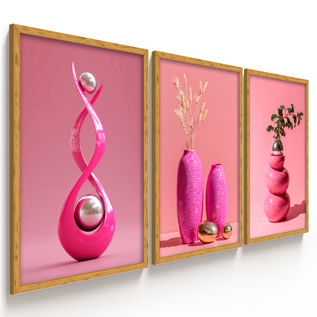Quadros Decorativos 3 Peças Abstrato Geométrico Esculturas Rosas Nordic Hall