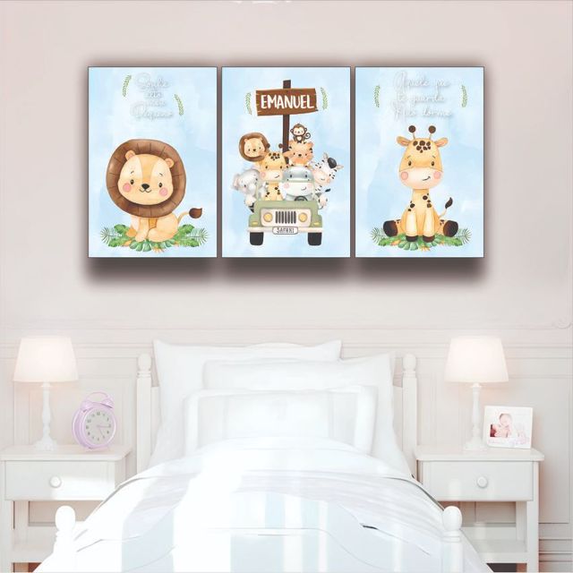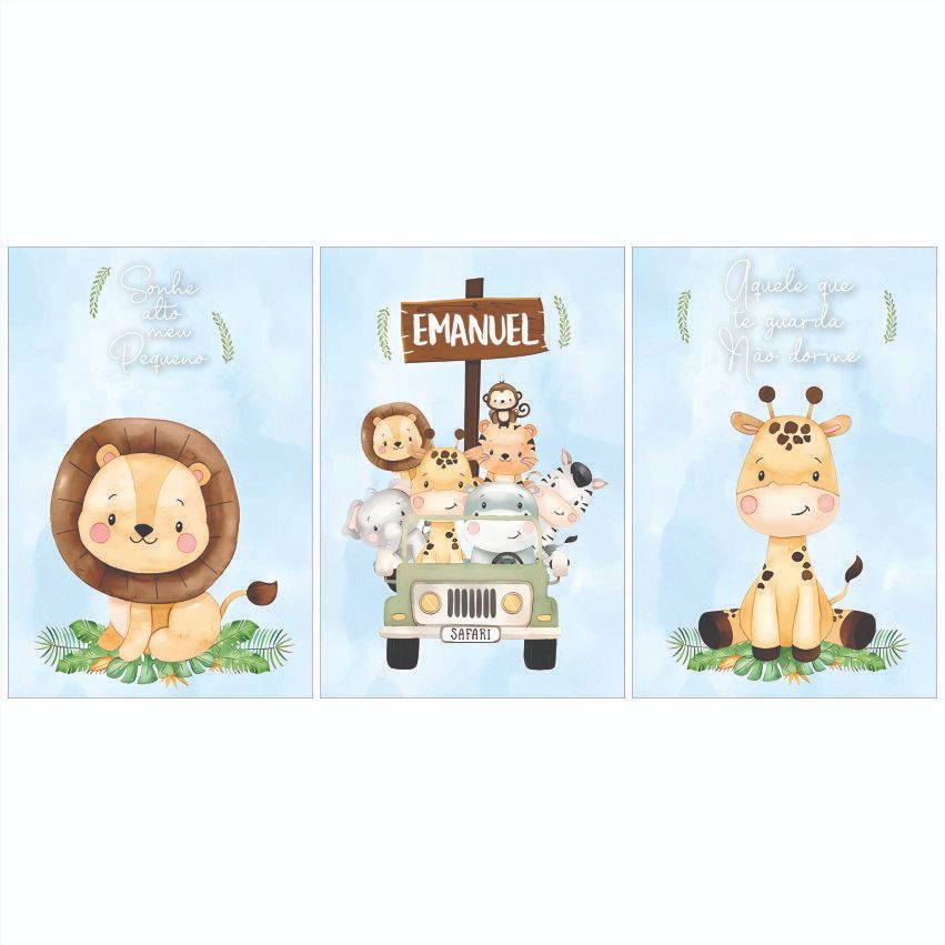 Quadros Decorativos 3 peças animais safari azul frase quadro personalizado para quarto de criança