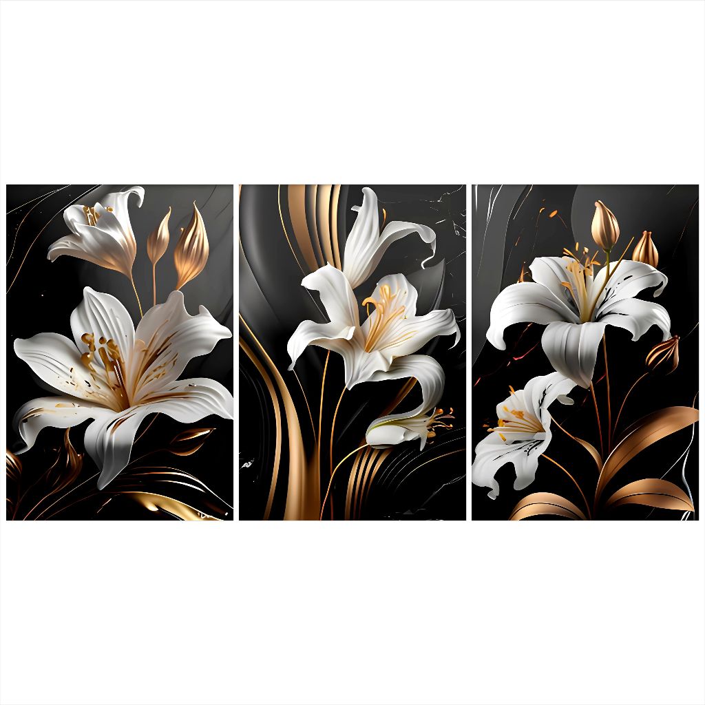 Quadros Decorativos 3 peças grandes Flores Flor Ouro Branco Preto Quarto Sala Escritório Clínicas