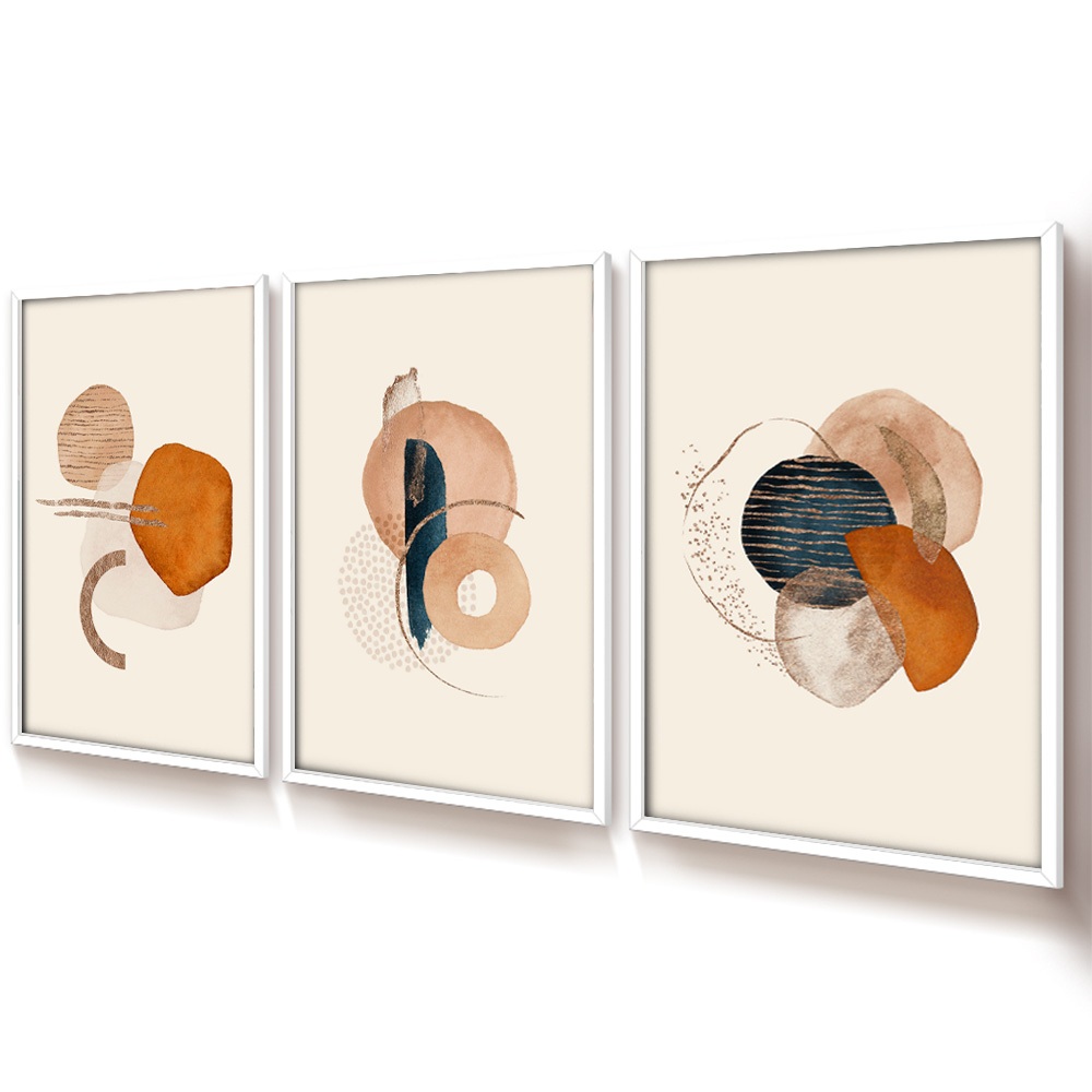 Quadros Decorativos Com MOLDURA Sala Quarto Trio Coleção Arte Estilo Boho Formas Bege Terra e Azul