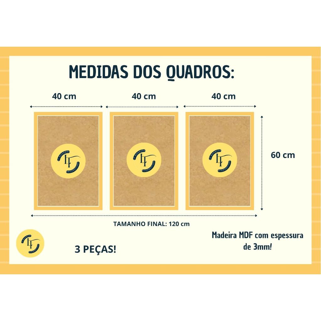 Quadros decorativos para interiores (como quartos, salas e outros cômodos). NÃO ACOMPANHA MOLDURA!!!! Tela em Chassi De Madeira MDF (reflorestada, tratada e imunizada). Informações Técnicas: - Quadros em tamanhos 40x60 cm. - O Quadro De Parede não precisa de moldura, pronto para pendurar na parede. - São feitos em adesivos ‘’vinil’' de alta qualidade em impressão. - Não é necessário furar a parede para instalação, pois, enviamos fitas com grande poder adesivo para melhor instalação. - É necessário na hora da instalação posicionar o Quadro De Parede em 01 cm de largura entre eles para melhor qualidade de visualização. Cuidados: - Limpeza: Utilizar pano seco ou espanador. - Utilizar em ambientes internos. - Não exponha o produto em Parede com sinais de umidade ou sob luz direta do sol, pois estes são prejudiciais à longevidade do mesmo. - Não coloque peso sobre o produto ou empilhe, isto poderá deformar sua tela. QUALQUER DÚVIDA SOBRE O PRODUTO CONTATE NOSSA EQUIPE, IREMOS ATENDÊ-LOS DA MELHOR MANEIRA POSSÍVEL E TIRAMOS TODAS SUAS DÚVIDAS!! Garantia do vendedor: 3 meses