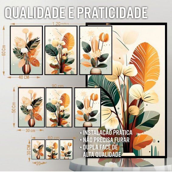 Kit contendo 3 Peças - 94cm x 50cm (COM ESPAÇAMENTO ENTRE AS PEÇAS DE 2cm) - 3 Tela (Altura x Largura): 50x30cm - 3 Tela (Altura x Largura): 20x30cm - 3 Tela (Altura x Largura):60x40cm Informações Técnicas: - O quadro não precisa de moldura, pronto para pendurar na parede. - São feitos em adesivos de alta qualidade em impressão. – Não é necessário furar a parede para instalação, pois, enviamos fitas com grande poder adesivo para melhor instalação. - É necessário na hora da instalação posicionar o quadro em 02 cm de largura entre eles para melhor qualidade de visualização. - Dimensão Real de Cada Quadro. OBS: (SELECIONAR NA VARIAÇÃO O TAMANHO DA PLACA) CUIDADOS: - Limpeza: Utilizar Pano Seco ou espanador. - Utilizar em ambientes internos. - Não exponha o produto em paredes com sinais de umidade ou sob luz direta do sol, pois estes são prejudiciais a longevidade do mesmo. - Não coloque peso sobre o produto ou empilhe, isto poderá deformar sua tela. Dúvidas Frequentes: - Reclamação ou Defeito? Caso o produto chegue com algum defeito ou você tenha alguma reclamação a fazer, pedimos que nos envie uma mensagem relatando o problema com o produto, nos informes no campo de mensagens primeiro, pois, a reclamação aberta pode demorar mais de 10 dias úteis para ser finalizada. No campo da mensagem iremos resolver o mais breve possível, para melhor atender sua solicitação. - Garantia? Oferecemos 90 dias para defeitos de fabricação. - Tem a pronta entrega? Sim, todos os nossos produtos estão à pronta entrega. - Vem pronto para pendurar? Sim, vai com uma fita dupla face que basta retirar o lacre e colar no local desejado, a fita é de alta qualidade e tem que ter cuidados ao manuseá-la. - Demais dúvidas estamos à disposição, basta nos chamar no campo mensagens que estamos aqui para melhor atendê-los