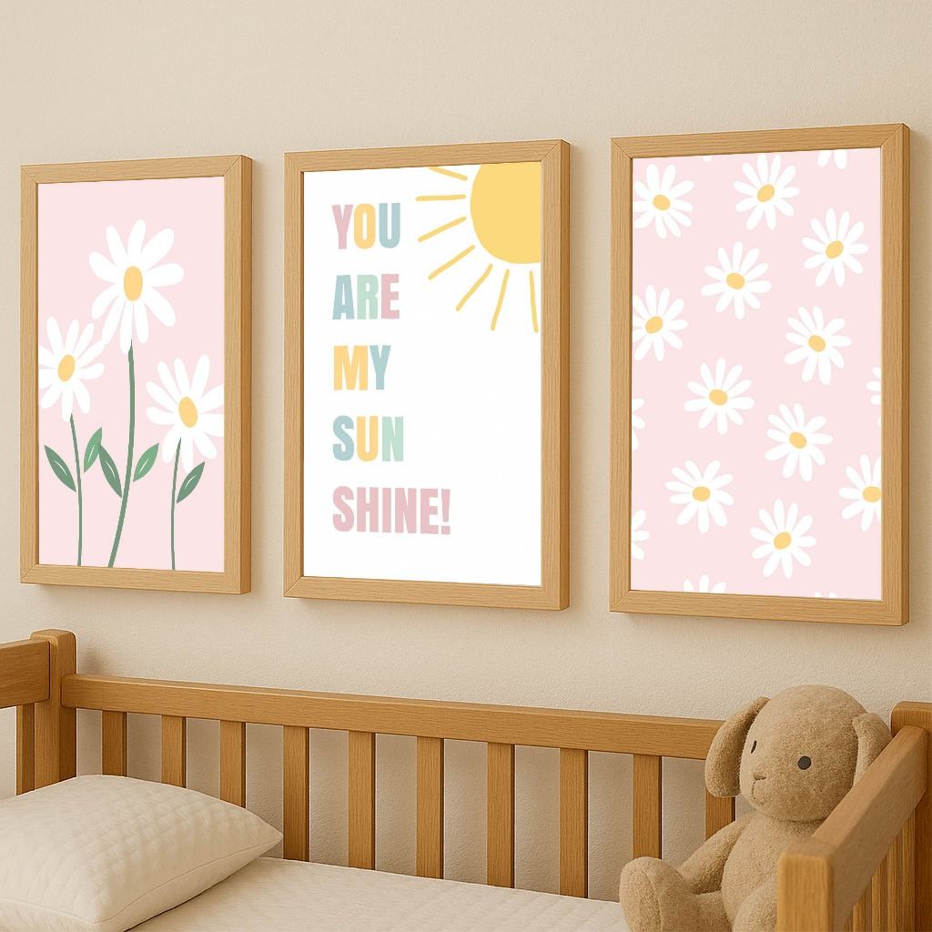 Quadros Decorativos Margaridas, Kit 3 Peças Quadro Irmãs, Decoração Quarto Meninas, Moldura Fake EXC