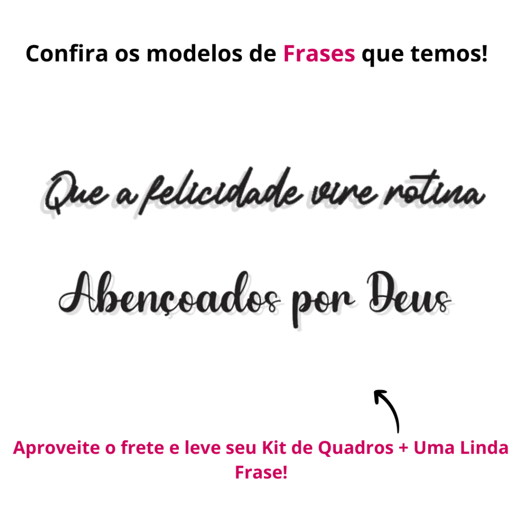 Quadros Decorativos Quarto Kit Quadro para Sala Quarto + Frase Decoração Nada melhor do que ter o nosso cantinho decorado do jeitinho que a gente quer, com uma instalação simples e rápida, deixando uma decoração maravilhosa! Decoração para sua sala, casa, quartos, cozinha. Quadros decorativos para todos os ambientes da sua casa! Quais os benefícios destes Quadros Decorativos? - Quadros e Frase Vazadas, dando um charme a mais para o seu ambiente! - Nossos Quadros não amarelam e utilizam pintura direto da fabrica, com a melhor fixação e cobertura! - Produzimos tudo em MDF que é muito superior ao MDP utilizado por outros vendedores. NÃO ACOMPANHA FITA DUPLA FACE!! FICHA TECNICA DOS QUADROS DECORATIVOS: Ficha Técnica Quadro Decorativo Kit Love Coração Amor: Material dos Quadros: MDF 3mm de Alta Qualidade Cor do Quadro: PRETO Dimensões de CADA Quadro: 30 cm de altura x 30 cm de Largura Ficha Técnica Quadro Decorativo Kit Mandala: Material dos Quadros: MDF 3mm de Alta Qualidade Cor do Quadro: PRETO Dimensões de CADA Quadro: 41 cm de altura x 29 cm de Largura Ficha Técnica Quadro Decorativo Kit Arvore da Vida: Material dos Quadros: MDF 3mm de Alta Qualidade Cor do Quadro: PRETO Dimensões de CADA Quadro: 41 cm de altura x 29 cm de Largura Ficha Técnica Quadro Decorativo Coração Individual: Material dos Quadros: MDF 3mm de Alta Qualidade Cor do Quadro: PRETO Dimensões de CADA Quadro: 30 cm de altura x 34 cm de Largura VENDEMOS A FRASE SOMENTE JUNTO COM OS QUADROS, NÃO VENDEMOS ELAS INDIVIDUAIS. FICHA TECNICA DAS FRASES: Ficha Técnica Frase Abençoados por Deus: Material: MDF 3mm de Alta Qualidade Cor: PRETO Dimensões da Frase montada: 13,5cm de altura x 90cm de Largura (Já com os espaçamentos) (A palavra Abençoados vai dividia no meio sendo Aben + çoados para segurança no transporte) Ficha Técnica Frase Felicidade Vire Rotina: Material: MDF 3mm de Alta Qualidade Cor: PRETO Dimensões da Frase montada: 10cm de altura x 95cm de Largura (Já com os espaçamentos) (A palavra Felicidade vai dividia no meio sendo Felici + dade para segurança no transporte) Perguntas Frequentes: Tem disponível em outras cores? No momento só produzimos este quadro na cor preta, uma cor elegante e sofisticada, que combina em qualquer ambiente! É possivel comprar somente a frase? No momento não estamos comercializando somente as frases, só é possivel adquirir junto aos quadros. É possivel comprar somente o quadro? Sim, os quadros são vendidos separadamente tambem. É só selecionar nas variações "Só quadros sem frase" e vamos lhe enviar com muito carinho!