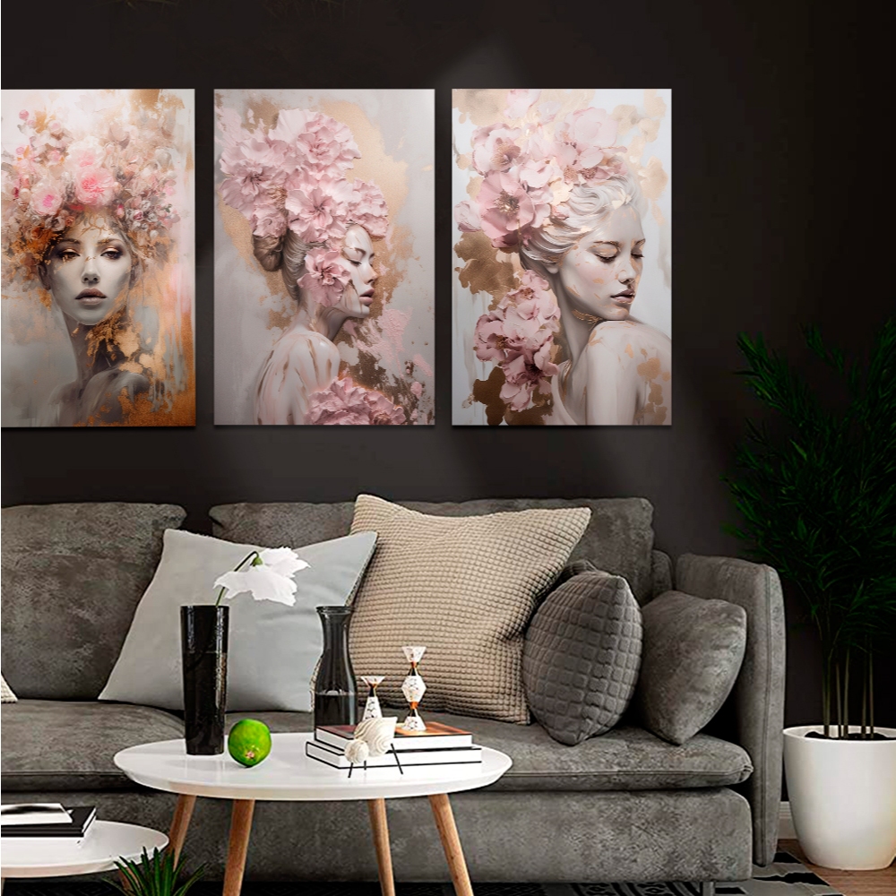 quadros mulheres maquiagem flores rosas para salão de beleza 3 peças com borda branca (MULHER ALBINA B/BRANCA)