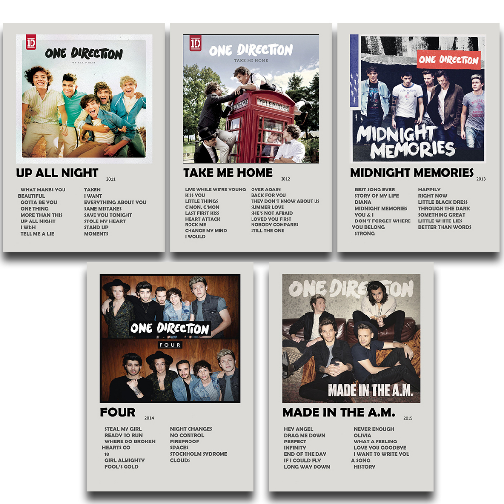 Quadros Decorativos One Direction - Albuns Do que você se orgulha? O que você venera? Os quadros vem com posters do grupo One Direction. Seu material é produzido em Placa de MDF 3mm. O produto já acompanha fita dupla face para você fixar na parede. O poster possui um acabamento em verniz para garantir maior durabilidade do produto. Características da Placa: - Material: MDF - Tamanho: A4 (20x28 cm) - Corte: A laser Características do Poster: - Papel fotográfico de alta qualidade - Acabamento em verniz Embalagem: Nossas placas são embaladas com o melhor material para evitar qualquer tipo de danificação do produto até seu endereço. Além disso, as placas são enviadas junto com placas de papelão, dando ainda mais proteção para a sua compra. Observações - Para maior durabilidade, evitar deixar os quadros em exposição direta ao sol. - Na limpeza utilizar somente um pano umedecido. - Objetos que ambientam a foto não acompanham o produto. - Utilizar preferencialmente verniz para manter a qualidade do produto ao longo dos anos