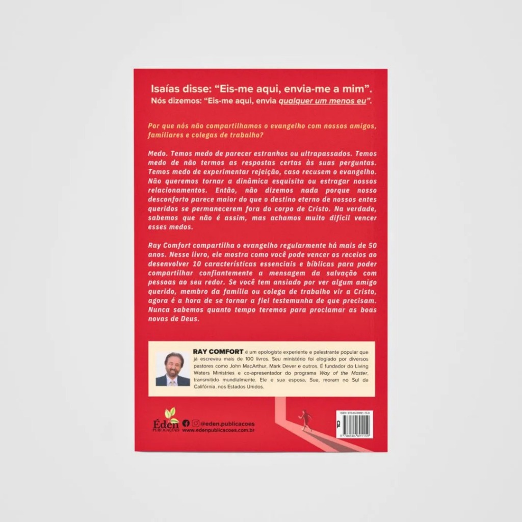 Isaías disse: “Eis-me aqui, envia-me a mim”. Nós dizemos: “Eis-me aqui, envia qualquer um menos eu”. Por que nós não compartilhamos o evangelho com nossos amigos, familiares e colegas de trabalho? Medo. Temos medo de parecer estranhos ou ultrapassados. Temos medo de não termos as respostas certas às suas perguntas. Temos medo de experimentar rejeição, caso recusem o evangelho. Não queremos tornar a dinâmica esquisita ou estragar nossos relacionamentos. Então, não dizemos nada porque nosso desconforto parece maior do que o destino eterno de nossos entes queridos se permanecerem fora do corpo de Cristo. Na verdade, sabemos que não é assim, mas achamos muito difícil vencer esses medos. Ray Comfort compartilha o evangelho regularmente há mais de 50 anos. Nesse livro, ele mostra como você pode vencer os receios ao desenvolver 10 características essenciais e bíblicas para poder compartilhar confiantemente a mensagem da salvação com pessoas ao seu redor. Se você tem ansiado por ver algum amigo querido, membro da família ou colega de trabalho vir a Cristo, agora é a hora de se tornar a fiel testemunha de que precisam. Nunca sabemos quanto tempo teremos para proclamar as boas novas de Deus. ELOGIOS AO AUTOR O ensino de Ray Comfort é precisamente correto. Fico feliz de saber que ele está na ativa. — JONI EARECKSON TADA, Autora best-seller, Fundadora do ministério Joni and Friends (EUA) Ray busca motivar crentes a cumprir a Grande Comissão e ele permanece fiel à mensagem bíblica. — JOHN MACARTHUR, Pastor, Grace Community Church, Sun Valley, Califórnia e Chanceler na The Master's University Sou grato [a Deus] por Ray Comfort e seu zelo em compartilhar o evangelho. — MARK DEVER, Pastor, Capitol Hill Baptist Church, Washington, D. C. (EUA) e Fundador do Ministério 9Marcas A habilidade de Ray Comfort para demolir, de forma perspicaz,o raciocínio vão dos homens é um dom. — JAMES WHITE, Apologista, Escritor e Fundador, Alpha and Omega Ministries Estou maravilhado e extremamente animado com a habilidade que Deus concedeu a Ray Comfort de levar o evangelho: da capela e da sala de aula para as ruas. — PAUL WASHER, Fundador e Diretor, Sociedade Missionária HeartCry (EUA) Sumário do Livro: 1. Amoroso: Sempre pronto 2. Obediente: A força secreta de Sansão 3. Determinado: A escolha do amor 4. Desafiador: Lutando contra o verdadeiro inimigo5. Focado: Olhos na Cruz6. Preparado: O dia mau 7. Verdadeiro: O que o evangelho não é 8. Treinado: O que você está pregando? 9. Fiel: Sobretudo10. Suplicante: Sendo francoPensamentos finais: Frênulo lingual Especificações: Capa Brochura - 180 págs 14x21cm