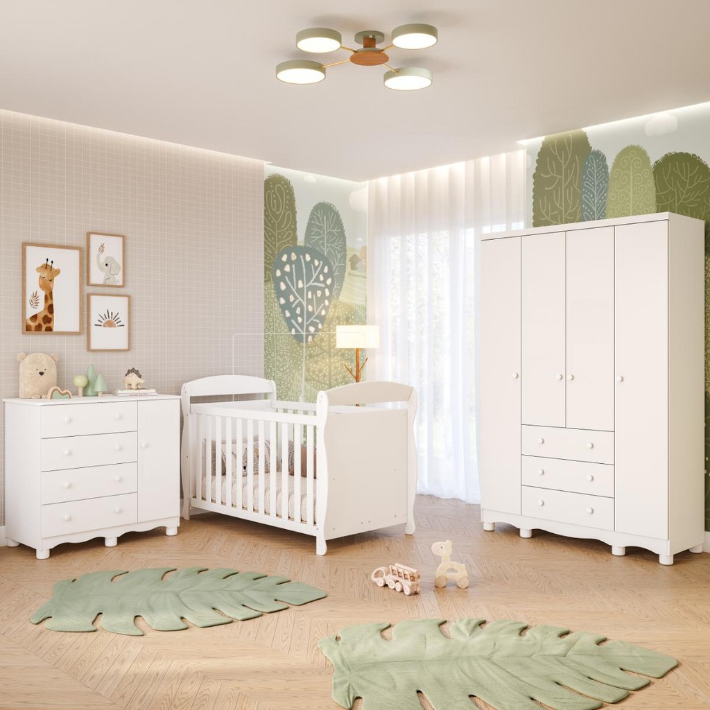 O Quarto de Bebê Completo com Berço Americano Marquesa, Guarda Roupa Junior e Cômoda Junior da Faura são perfeitos para quem deseja um Quarto Infantil onde a praticidade, segurança e aconchego sejam pontos essenciais para a composição do quarto do seu Bebê, sem esquecer é claro de uma linda decoração. Todos os berços da Faura são certificados pelo INMETRO. Um requisito fundamental para sua segurança e a do bebê! O Berço Marquesa, padrão americano, é um produto feito com muito cuidado para compor o quarto do seu bebê. Produzido com material 100% MDF. Vem com varal para mosquiteiro incluso e sua pintura atóxica permite noites mais tranquilas e mais seguras. Possui a base do colchão com 03 opções de altura, acompanha o crescimento do seu bebê. O Berço Marquesa é um produto versátil, 3 em 1, que vira Mini Cama e Mini Sofá. A Cômoda Junior é um produto que atende a diversos ambientes de sua casa, ideal para seu bebê, sua criança e até para uso adulto. Possui o tampo com bordas laqueadas e tem o diferencial do rodapé que pode ser montado no desenho reto ou com o rodapé ondulado. O Guarda Roupa Junior 04 portas é um produto 100% MDF, sua pintura é atóxica, possui cabideiro metálico, puxadores ABS, corrediças telescópica, pé em ABS. FICHA TÉCNICA -Berço Marquesa Dimensões do berço montado: Altura 99 cm x Largura 148 cm x Profundidade: 78,4 cm Dimensões sugeridas para o colchão: Comprimento: 130 cm x Altura 12 cm (Máximo permitido) x Largura 70 cm (Colchão NÃO incluso) -Cômoda Infantil Junior Altura: 88 cm Largura: 95,3 cm Profundidade: 42,3 cm Quantidade de Gavetas: 04 Gavetas (Peso suportado 4Kg) Quantidade de Portas: 01 Porta Material: 100% MDF Cores Disponíveis: Branco Brilho, Amêndoa/Branco Acabamento do Produto: Pintura UV Atóxica/ Pintura PU e Fita de Bordo Tipo de Corrediça: Telescópica Tipo de Cabideiro: Metálico Tipo de Puxadores: ABS Tipo de Pés: ABS( Altura 5,5cm) -Guarda Roupa Infantil Junior Altura: 188,5 cm Largura: 122,1 cm Profundidade: 41,5 cm Quantidade de Gavetas: 03 Gavetas (Peso suportado 4Kg) Quantidade de Portas: 04 Portas Material: 100% MDF Cores Disponíveis: Branco Brilho, Amêndoa/Branco Acabamento do Produto: Pintura UV Atóxica/ Pintura PU e Fita de Bordo Tipo de Corrediça: Telescópica Tipo de Cabideiro: Metálico Tipo de Puxadores: ABS Tipo de Pés: ABS(Altura 5,5cm) -Manual de Montagem: Manual segue na embalagem do produto - Os entregadores não estão autorizados a subir escadas ou elevadores, realizando a entrega apenas na recepção ou portaria, conforme as normas trabalhistas dos transportadores. Recomendamos que os clientes considerem essa limitação ao realizar suas compras - Imagens meramente ilustrativas: a decoração não acompanham o produto. -Recomendações de Uso, Manutenção e Limpeza: Para limpeza utilize somente pano limpo e macio, ligeiramente umedecido em água, seguido de um pano seco. Perguntas Frequentes: A - É fácil montar o Berço Marquesa, Guarda Roupa Infantil Junior e Cômoda Infantil Junior? Nível de complexidade alta, sugerimos a contratação de um montador especializado. Nós não realizamos a montagem dos produtos e não oferecemos esse serviço. B - Tenho a opção de comprar o Berço Marquesa, Guarda Roupa Infantil Junior ou Cômoda Infantil Junior separados? Sim, só buscar aqui no site que vai encontrar nossa oferta. C - Qual a configuração da Cômoda Infantil Junior ? É uma cômoda infantil com 4 gavetas e 1 porta. D - Como organizar a Cômoda infantil Junior ? Você vai naturalmente encontrar a melhor maneira de organizar sua cômoda. Entretanto, vale a pena pontuar algumas situações: 1-A cômoda deve estar sempre limpa*; 2-O Trocador (caso você tenha) pode ocupar bastante espaço no tampo da cômoda; 3-Primeira Gaveta: Utilize para os produtos de Higiene do bebê; 4-Demais Gavetas: Utilize para roupas e acessórios do bebê.