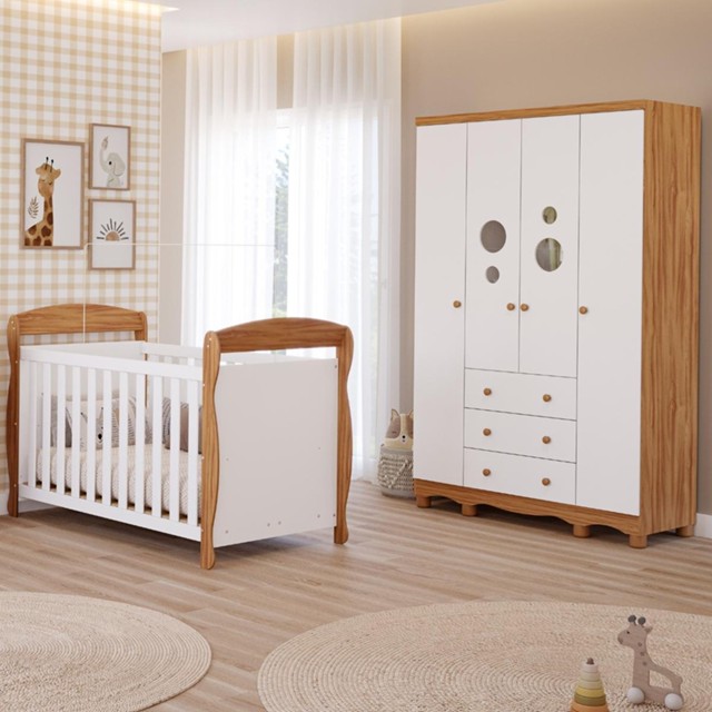 O Quarto de Bebê Completo com Berço Americano Marquesa e Guarda Roupa Bolinha da Faura são ideais para você que busca uma linda decoração, sem esquecer da praticidade, segurança, aconchego do seu Bebê. Todos os berços da Faura são certificados pelo INMETRO. Um requisito fundamental para sua segurança e a do bebê! O Berço Marquesa, padrão americano, é um produto feito com muito cuidado para compor o quarto do seu bebê. Produzido com material 100% MDF. Vem com varal para mosquiteiro incluso e sua pintura é atóxica, noites mais tranquilas e mais seguras. Possui a base do colchão com 03 opções de altura, acompanha o crescimento do seu bebê. O Berço Marquesa é um produto versátil, 3 em 1, que vira Mini Cama e Mini Sofá. O Guarda Roupa Bolinha 04 portas é um produto 100% MDF, sua pintura é atóxica, possui cabideiro metálico, puxadores ABS, corrediças Telescópicas, pé em ABS, 02 modelos de rodapés inclusos e portas com PETG cristal. FICHA TÉCNICA -Berço Marquesa Dimensões do berço montado: Altura 99 cm x Largura 148 cm x Profundidade: 78,4 cm Dimensões sugeridas para o colchão: Comprimento: 130 cm x Altura 12 cm (Máximo permitido) x Largura 70 cm (Colchão NÃO incluso) -Guarda Roupa Infantil Bolinha Altura: 188 cm Largura: 122,1 cm Profundidade: 41,5 cm Quantidade de Gavetas: 03 Gavetas (Peso suportado 4Kg) Quantidade de Portas: 04 Portas Material: 100% MDF Cores Disponíveis: Branco Brilho, Amêndoa/Branco. Acabamento do Produto: Pintura UV Atóxica/ Pintura PU e Fita de Bordo Acabamento das Portas: PETG Cristal (Acrílico transparente) Tipo de Corrediça: Telescópica Tipo de Cabideiro: Metálico Tipo de Puxadores: ABS Tipo de Pés: ABS(Altura 6cm) -Manual de Montagem: Manual segue na embalagem do produto - Os entregadores não estão autorizados a subir escadas ou elevadores, realizando a entrega apenas na recepção ou portaria, conforme as normas trabalhistas dos transportadores. Recomendamos que os clientes considerem essa limitação ao realizar suas compras - Imagens meramente ilustrativas: a decoração não acompanham o produto. -Recomendações de Uso, Manutenção e Limpeza: Para limpeza utilize somente pano limpo e macio, ligeiramente umedecido em água, seguido de um pano seco. Perguntas Frequentes: A - É fácil montar o Berço Marquesa e Guarda Roupa Infantil Bolinha? Nível de complexidade alta, sugerimos a contratação de um montador especializado. Nós não realizamos a montagem dos produtos e não oferecemos esse serviço. B - Tenho a opção de comprar o Berço Marquesa, Guarda Roupa Infantil Bolinha ou Cômoda Infantil Bolinha separados? Sim, só buscar aqui no site que vai encontrar nossa oferta. C - Qual a configuração do Guarda Roupa Infantil Bolinha? O Guarda Roupa Bolinha 04 portas 3 gavetas, e portas com PETG cristal. D - Como organizar a Guarda Roupa infantil Bolinha? Você vai naturalmente encontrar a melhor maneira de organizar. Entretanto, vale a pena pontuar algumas situações: 1-O Guarda Roupa deve estar sempre limpo*; 2-Primeira Gaveta: Utilize para os produtos de Higiene do bebê; 3-Demais Gavetas: Utilize para roupas e acessórios do bebê.