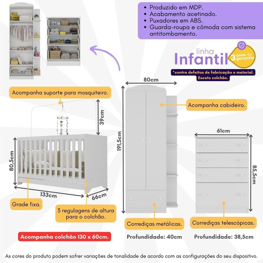 🍼 Quarto Completo com Colchão, Poltrona de Amamentação e Puff João e Maria Multimóveis MP4104 Transforme o quartinho do bebê em um espaço aconchegante, funcional e cheio de carinho com o Quarto Completo João e Maria da Multimóveis. Pensado para acompanhar os primeiros anos de vida do bebê, o conjunto une praticidade, conforto e design delicado em um só ambiente. 🌟 O que torna este quarto completo especial Berço 3 em 1: se transforma em mini cama e sofá, acompanhando o crescimento do bebê. Lastro com 3 regulagens de altura e suporte para mosquiteiro, garantindo noites mais seguras. Grade Soft em PVC atóxico, ecologicamente correta e com proteção antiamarelamento. Cômoda com 4 gavetas e sistema antitombamento, oferecendo segurança e organização no dia a dia. Roupeiro com amplo espaço interno e gaveta espaçosa com corrediças metálicas para abrir e fechar com leveza. Detalhes Flex: escolha a cor dos acabamentos (Branco, Rosa, Azul ou Cinza) no momento da montagem. Poltrona de amamentação com puff: estrutura em eucalipto, tecido veludo com balanço suave, assento D23 e suporte de até 110 kg — ideal para tornar esse momento mais confortável. Colchão D18 incluso: com espuma macia e tratamento antiácaro e antialérgico, indicado para crianças até 3 anos. 🧸 Certificação e qualidade Multimóveis ✔️ Berço certificado pelo INMETRO (Selo n° 0000085/2018) ✔️ Produzido em MDP de alta resistência, com pintura UV ✔️ Durabilidade, conforto e segurança em cada detalhe ⚙️ Conteúdo da Embalagem 1 Berço padrão americano 1 Colchão D18 1 Cômoda com 4 gavetas 1 Guarda-roupas 1 Poltrona de amamentação 1 Puff Kit ferragens e manual de montagem 📏 Dimensões do produto montado Berço: A 80,5 cm | L 133 cm | P 66 cm Colchão: A 10 cm | L 130 cm | P 60 cm Cômoda: A 85,5 cm | L 61 cm | P 38,5 cm Guarda-roupas: A 191,5 cm | L 80 cm | P 40 cm Poltrona: A 90 cm | L 65 cm | P 64 cm Puff: A 41 cm | L 33 cm | P 33 cm 🛠️ Produto entregue desmontado, com manual e ferragens para montagem. 🎨 As cores podem variar de acordo com a configuração da tela. 📸 Imagem ilustrativa — itens de decoração não acompanham o produto. 📏 Dimensões do produto montado Berço - Altura: 80,5cm | Largura: 133cm | Profundidade: 66cm Colchão - Altura: 10cm | Largura: 130cm | Profundidade: 60cm Cômoda - Altura: 85,5cm | Largura: 61cm | Profundidade: 38,5cm Guarda-Roupas - Altura: 191,5cm | Largura: 80cm | Profundidade: 40cm Poltrona - Altura: 90cm | Largura: 65cm | Profundidade: 64cm Puff - Altura: 41cm | Largura: 33cm | Profundidade: 33cm 🛠️ Produto entregue desmontado, com manual e ferragens para montagem. 🎨 As cores podem variar de acordo com a configuração da tela. 📸 Imagem ilustrativa — itens de decoração não acompanham o produto. 💡 Por que escolher o Quarto Completo João e Maria Multimóveis ✔️ Solução completa: conforto, estilo e praticidade no mesmo kit ✔️ Ideal para acompanhar todas as fases do bebê ✔️ Materiais duráveis e acabamento refinado ✔️ Custo-benefício excelente para quem busca qualidade e beleza