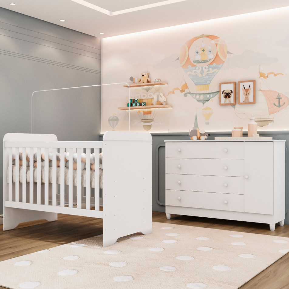Quarto de Bebê 100% MDF - Cômoda Grande 4 Gavetas com Porta e Berço 3 em 1 - Branco Carolina Baby