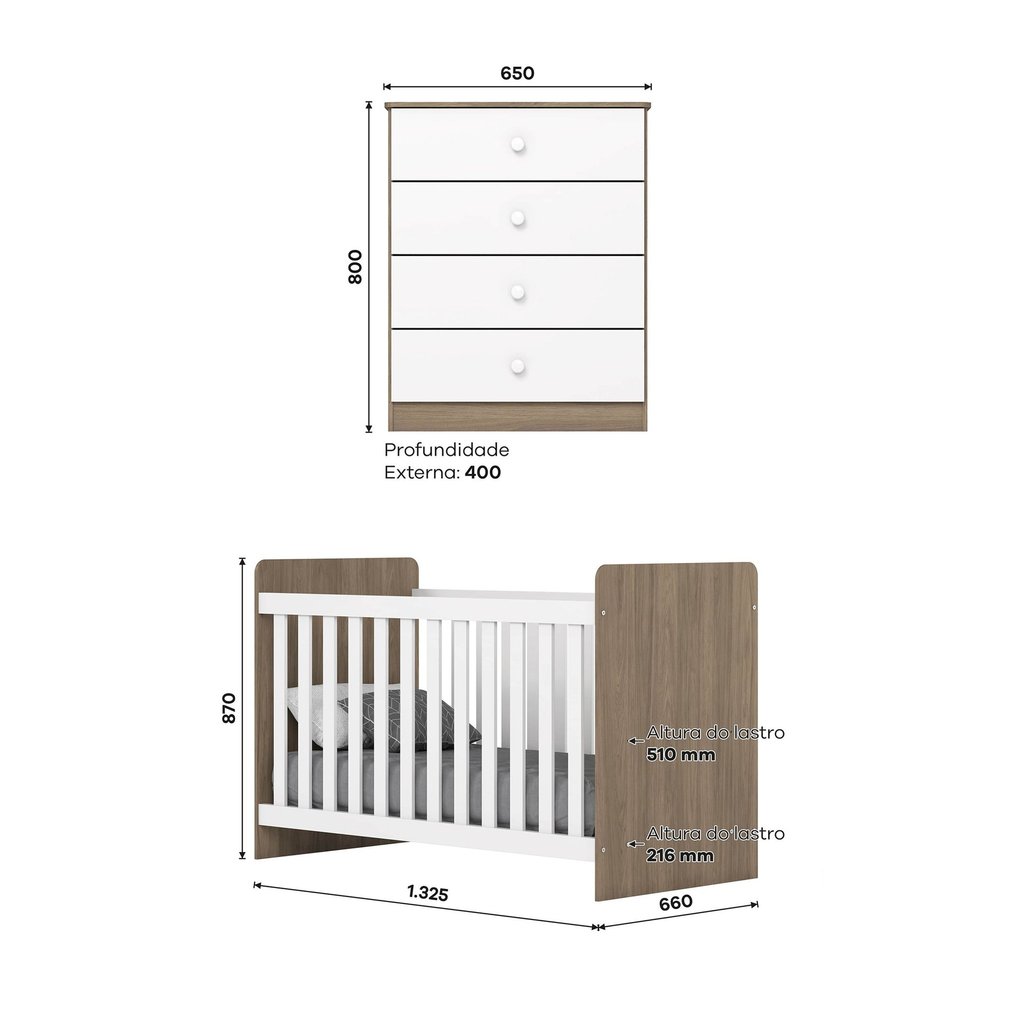 O Conjunto Sonho Encantado é composto por 1 Berço Mini Cama aconchegante e encantador, desenvolvido com um formato otimizado visando à comodidade e o aconchego para o seu bebê. Produzido em MDP, com medidas de 870 mm de altura, 1.325mm de largura e 660 mm de profundidade, ideal para colchão de 1,30 x 0,60m, ele conta também com uma bela Cômoda que com medidas de 800mm de Altura, 650mm de Largura e 410mm de Profundidade. Capitonê: Não Garantia: 03 Meses Escala de Brilho: Brilhante O Conjunto Contém: Berço/Cômoda Origem do Produto: Nacional Ambiente Principal: Quarto de Bebê Material Principal: MDF/MDP Possui Certificado: Sim Tipo de Guarda-roupa: Bebê Medida de Cada Item (A x L x P) (novo): Berço 87x132,5x66cm | Cômoda 80x65x40cm Marca: Espresso Móveis Cor: Rústico/Branco Cor do Produto: Rústico/Branco Cor Predominante: Branco Linha ou Coleção: Sonho Encantado Certificado INMETRO (código): 1.0430693069307