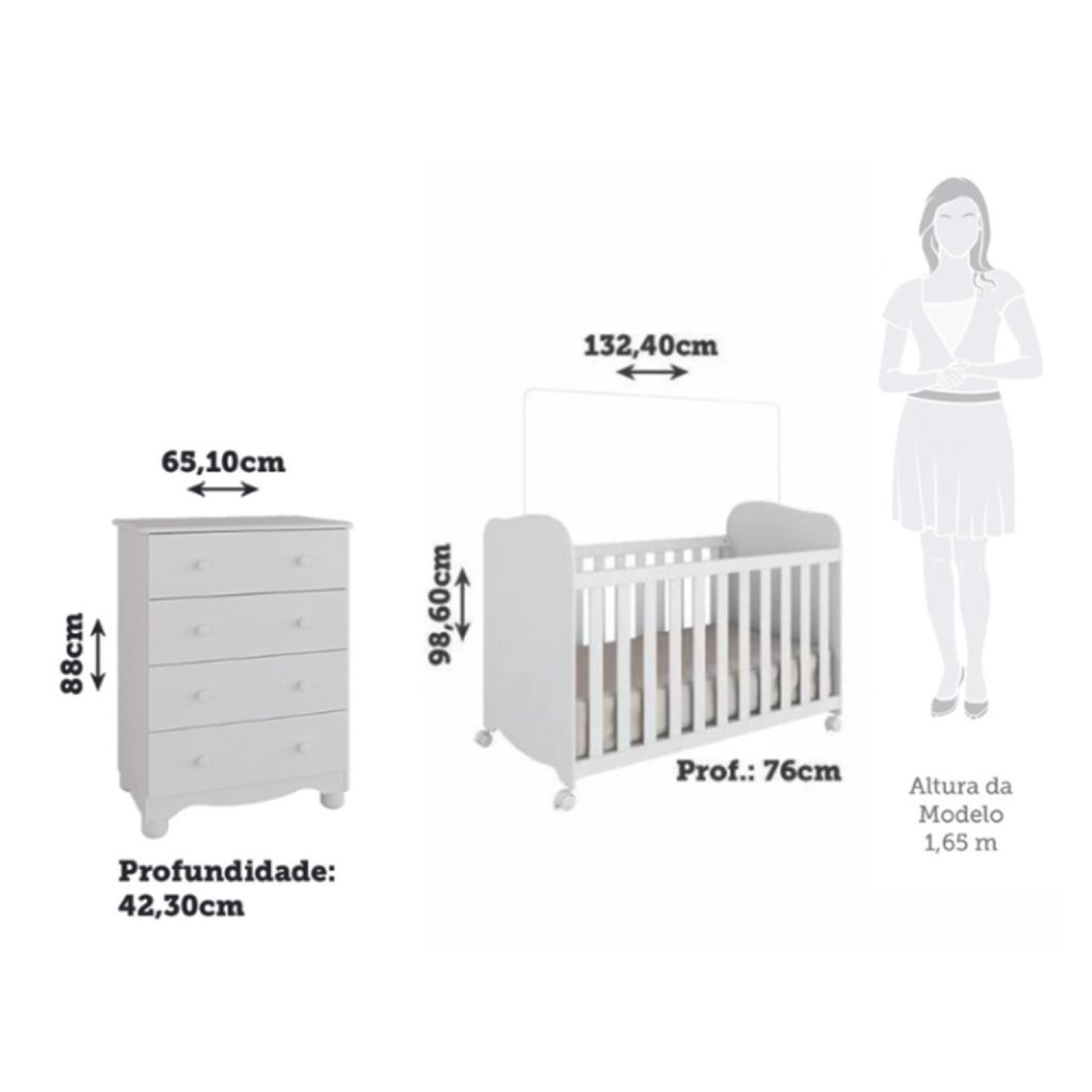 Procurando por móveis que ofereçam conforto e praticidade para a sua família? Esta proposta é perfeita para você! Produzidos em 100% MDF com acabamento em pintura UV atóxica, esse quarto garante a segurança de todos. A cômoda possui 4 gavetas com corrediças telescópicas, proporcionando facilidade no uso. Já o berço possui bordas arredondadas, certificado pelo INMETRO, e acompanha varal para mosquiteiro. Aproveite essa oportunidade e adquira já o seu! Medidas do Ambiente (cm): Cômoda: 88 x 65,1 x 42,3 (AxLxP - cm) Berço: 98,6 x 132,4 x 76 (AxLxP) Capitonê: Não Garantia: 03 Meses Acabamento: Verniz Possui Grade: Sim Possui Portas: Não Possui Gavetas: Sim Possui Rodízio: Sim Suporta Até (kg): 40 Pintura Atóxica: Sim Possui Espelhos: Não Possui Trocador: Não Escala de Brilho: Brilhante Material do Fundo: HDF O Conjunto Contém: Berço/Cômoda Origem do Produto: Nacional Altura do Conjunto: 98.6 Ambiente Principal: Quarto de Bebê Material da Gaveta: MDF Material Principal: MDF Possui Certificado: Sim Possui Prateleiras: Não Largura do Conjunto: 132.4 Material do Estrado: MDF Acabamento da Gaveta: Pintura UV Tipo de Grade do Berço: Fixa Profundidade do Conjunto: 76 Tipo de Puxador da Gaveta: Externo Escala de Brilho da Gaveta: Brilhante Tipo de Corrediça da Gaveta: Metálica Telescópica Material do Puxador da Gaveta: Plástico Acompanha Manual de Instalação: Sim Estrado com Regulagem de Altura: Sim Informações Complementares (Novo): Material do Estrado: MDF e madeira/laminado de madeira Medida de Cada Item (A x L x P) (novo): Cômoda: 88 x 65,1 x 42,3| Berço: 98,6 x 132,4 x 76 (AxLxP - cm) Estrado Regulável em Quantas Posições: 3 Permite a Utilização de Cama Auxiliar: Não Marca: Espresso Móveis Cor Interna: Branco Cor: Branco Brilho Cor do Produto: Branco Brilho Itens Inclusos: 1 Berço, 1 Cômoda, Kit Ferragens e Manual de Montagem Cor Predominante: Branco Linha ou Coleção: Mimo Peso de Cada Item: Berço: 54,89kg |Cômoda: 21,7kg Certificado INMETRO (código): 013209/2022 Quantidade de Gavetas: 04 Gavetas