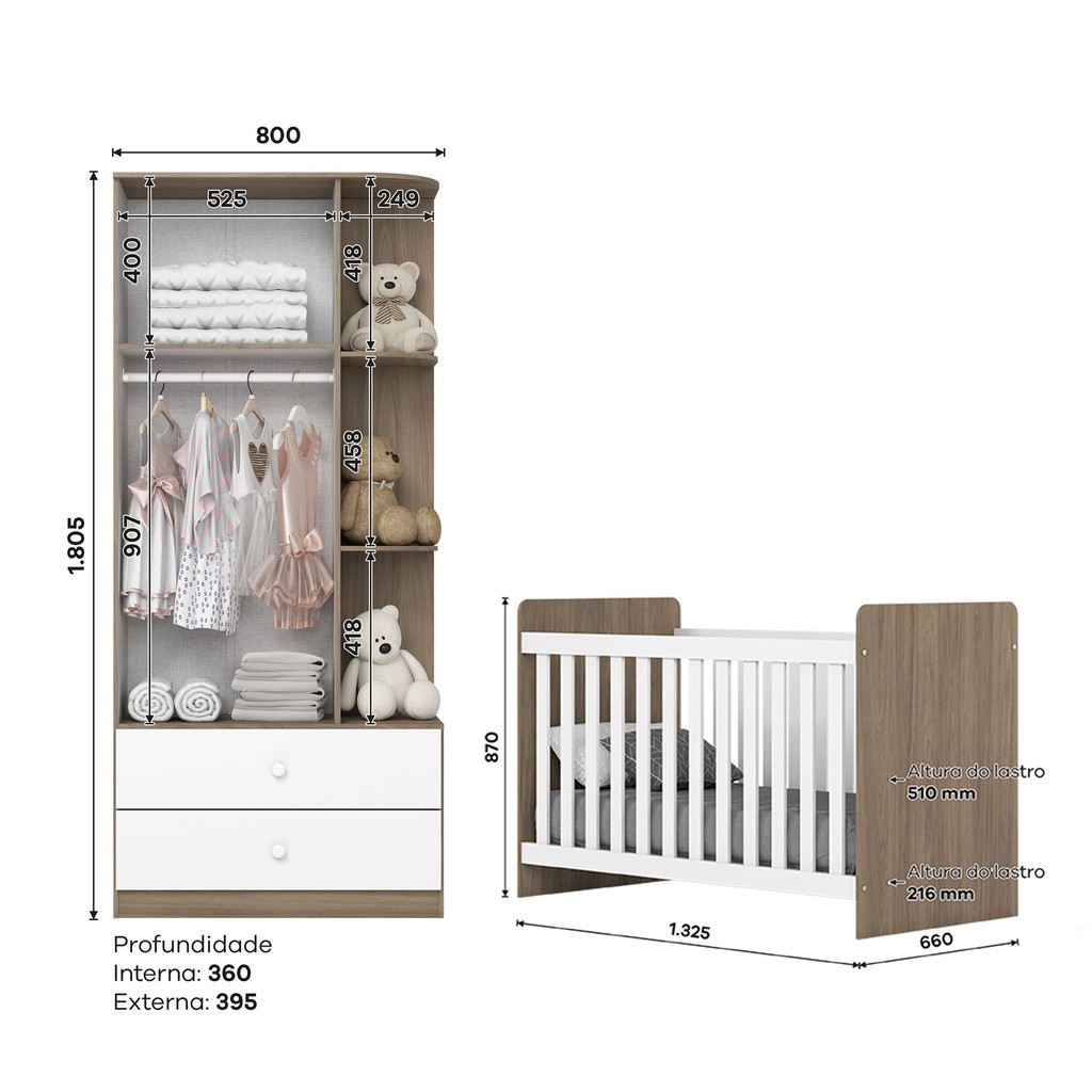 O Conjunto Sonho Encantado é composto por 1 Berço Mini Cama aconchegante e encantador, desenvolvido com um formato otimizado visando à comodidade e o aconchego para o seu bebê. Produzido em MDP, com medidas de 870 mm de altura, 1.325mm de largura e 660 mm de profundidade, ideal para colchão de 1,30 x 0,60m. Além de berço, este móvel possui configurações para transformá-la em mini-cama, desta forma você possui 02 móveis em um só produto proporcionando a reutilização do produto com o passar dos anos. Conta também com um belo Guarda Roupa, que é produzido em MDP com 1.800 mm de Altura, 800 mm de Largura e 400 mm de Profundidade. Gavetas com corrediças metálicas que permitem um deslize mais seguro e suave.! Capitonê: Não Garantia: 03 Meses Escala de Brilho: Fosco Serviço Montagem: 114259443 O Conjunto Contém: Berço/Guarda-Roupa Origem do Produto: Nacional Ambiente Principal: Quarto de Bebê Material Principal: MDF/MDP Possui Certificado: Sim Tipo de Guarda-roupa: Bebê Medida de Cada Item (A x L x P) (novo): Berço Mini Cama (AxLxP) 87cm X 132,5cm X 66cm; Roupeiro Labirinto (AxLxP) 180cm X 80cm X 40cm Marca: Espresso Móveis Cor: Rústico/Branco Cor do Produto: Rústico/Branco Cor Predominante: Marrom Linha ou Coleção: Sonho Encantado Certificado INMETRO (código): INMETRO do Berço: 001 087/2020