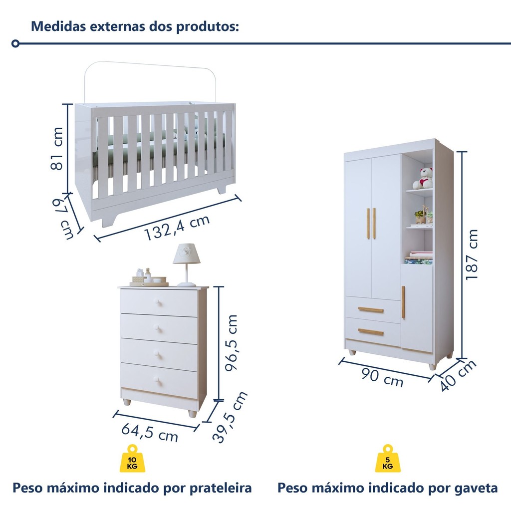 O Quarto de Bebê Completo Nina oferece tudo o que você precisa para criar um ambiente acolhedor e organizado para seu bebê. Com berço, cômoda e guarda-roupa 1 porta, o conjunto é perfeito para otimizar o espaço e garantir praticidade no dia a dia. Cada peça é cuidadosamente projetada em MDF de alta qualidade, com acabamento que proporciona resistência e durabilidade. Ideal para quem deseja um quarto funcional, elegante e seguro para o bebê, com a garantia de um produto que vai durar por muitos anos. O que vem no conjunto de quarto de bebê? O conjunto inclui berço, cômoda e guarda-roupa 1 porta. O berço já vem com colchão? Não, o colchão precisa ser adquirido separadamente. Tamanho Indicado do Colchão 130cm x 61cm Capitonê: Não Garantia: 03 Meses Altura (cm): 187 Largura (cm): 90 Porta Janelada: Não Suporta Até (kg): 140 Profundidade (cm): 40 Tipo de Estrado: Removível Acompanha Colchão: Não O Conjunto Contém: Berço/Guarda-Roupa/Cômoda Ambiente Principal: Quarto de Bebê Material Principal: MDF Possui Certificado: Sim Profundidade do Conjunto: 67 Tipo de Corrediça da Gaveta: Metálica Telescópica Estrado com Regulagem de Altura: Sim Informações Complementares (Novo): A Cômoda Nina possui 04 gavetas com corrediças telescópicas, que permite um deslize mais seguro e suave, amplo espaço para acomodar as roupas e objetos do bebê. Ela acompanha o Kit Anti-Tombamento, que garente segurança ao bebê. Produzido 100% em MDF. Com Medida de Cada Item (A x L x P) (novo): Berço; Altura: 81cm Largura: 132,4cm Profundidade: 67cm Cômoda; Altura: 96,5cm Largura: 64,5cm Profundidade: 39,5cm Roupeiro; Altura: 187cm Largura: 90cm Profundidade: 40cm Estrado Regulável em Quantas Posições: 3 Marca: Espresso Móveis Cor: Branco Itens Inclusos: 1 Cômoda, 1 Berço, 1 Guarda Roupa e manual de montagem. Linha ou Coleção: Nina Certificado INMETRO (código): OCAN-BER.278/19-4 Tamanho do Colchão Indicado (L x C): 130cm x 61cm