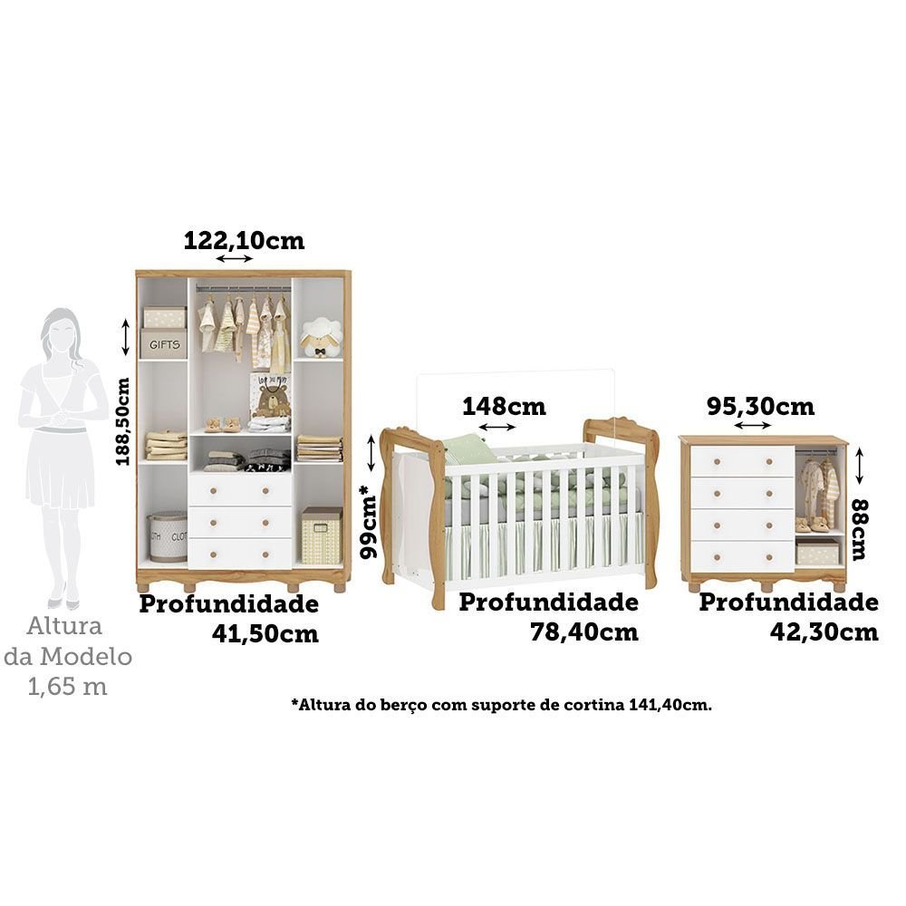Qualidade, beleza, conforto e segurança para toda família na hora de montar o quartinho do(a) bebê. Produtos estrurados em 100% MDF e com acabamento em pintura UV atóxica. O berço possui padrão de colchão americano, estrado com altura regulável e todas as bordas arredondadas e laqueadas, que proporcionam mais segurança e uma sensação agradável ao toque, além de poder ser usado como mini cama ou mini sofá. Já o guarda roupas e a cômoda possuem gavetas que deslizam suavemente por corrediças telescópicas, cabideiro metálico e algumas prateleiras. Ambiente composto por: - 1 Guarda Roupa 4 Portas e 3 Gavetas 188,50 x 122,10 x 41,50 (A x L x P - cm) - 1 Cômoda 4 Gavetas 1 Porta 88 x 95,30 x 42,30 (A x L x P - cm) - 1 Berço Mini Cama 3 em 1 99 x 148 x 78,40 (A x L x P - cm) Capitonê: Não Garantia: 03 Meses Acabamento: Pintura UV Porta Janelada: Não Possui Rodízio: Não Pintura Atóxica: Sim Acompanha Colchão: Não O Conjunto Contém: Berço/Guarda-Roupa/Cômoda Ambiente Principal: Quarto de Bebê Material Principal: MDF Possui Certificado: Sim Acompanha Cama Auxiliar: Não Estrado com Regulagem de Altura: Sim Acompanha Suporte para Mosquiteiro: Sim Sem Véu Permite a Utilização de Cama Auxiliar: Não Marca: Espresso Móveis Cor: Branco Brilho/Amêndoa Cor do Produto: Branco Brilho/Amêndoa Itens Inclusos: 1 Berço, 1 Guarda roupa, 1 Cômoda, Kit Ferragens e Manual de Montagem Cor Predominante: Branco Quantidade de Portas: 4 Portas