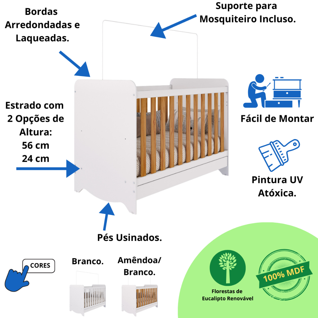 Quarto de bebê completo com o Berço Americano Ben e Guarda Roupa de 2 portas e 3 gavetas Júnior da Faura é a escolha ideal para o quarto do seu bebê. Com uma excelente relação custo-benefício, garantimos qualidade, segurança e um design harmonizado. Nossas opções compactas ajudam a organizar o ambiente, tornando a sua rotina diária perfeita e agradável. Proporcione conforto e estilo ao quarto do seu bebê com esse lindo quarto. Ficha Técnica -Berço Ben Dimensões do berço montado: Altura 97,4 cm x Largura 132,4 cm x Profundidade: 76 cm Dimensões sugeridas para o colchão: Comprimento: 130 cm x Altura 12 cm (Máximo permitido) x Largura 70 cm (Colchão NÃO incluso) -Guarda Roupa Infantil Júnior 2 portas Altura: 183 cm Largura: 61,7 cm Profundidade: 41,5 cm Quantidade de Gavetas: 03 Gavetas ( Peso suportado 4Kg) Quantidade de Portas: 02 Portas. Material: 100% MDF Acabamento do Produto: Pintura UV Atóxica/ Pintura PU e Fita de Bordo Tipo de Corrediça: Telescópica Tipo de Cabideiro: Metálico Tipo de Puxadores: ABS revestidos Recomendações de Uso, Manutenção e Limpeza: Para limpeza utilize somente pano limpo e macio, ligeiramente umedecido em água (apenas o bastante para remover a poeira), seguido de um pano seco. Perguntas Frequentes: A - É fácil montar o Berço Ben e o Guarda Roupa Infantil Júnior da Faura? Nível de complexidade alta, sugerimos a contratação de um montador especializado. Nós não realizamos a montagem dos produtos e não oferecemos esse serviço. B - Tenho a opção de comprar Berço Ben, Guarda Roupa Infantil Júnior e Cômoda Infantil Júnior Simples separado? Sim, só buscar aqui no site que vai encontrar nossa oferta. C - Qual a configuração do Guarda Roupa Infantil Júnior da Faura? Guarda Roupa Infantil Júnior com 3 gavetas e 2 portas. D - Como organizar o Guarda Roupa Júnior 2 Portas? Você vai naturalmente encontrar a melhor maneira de organizar Guarda Roupas. Entretanto, vale a pena pontuar algumas situações: 1-O Guarda Roupa Júnior deve estar sempre limpo*; 2-Primeira Gaveta: Utilize para os produtos de Higiene do bebê; 3-Demais Gavetas: Utilize para roupas e acessórios do bebê. E - Quais as cores disponíveis para o Berço Ben, Guarda Roupa Infantil Júnior e Cômoda Infantil Júnior da Faura? Temos nas cores Branco Brilho, Amêndoa/Branco e Branco/Grade Amêndoa.
