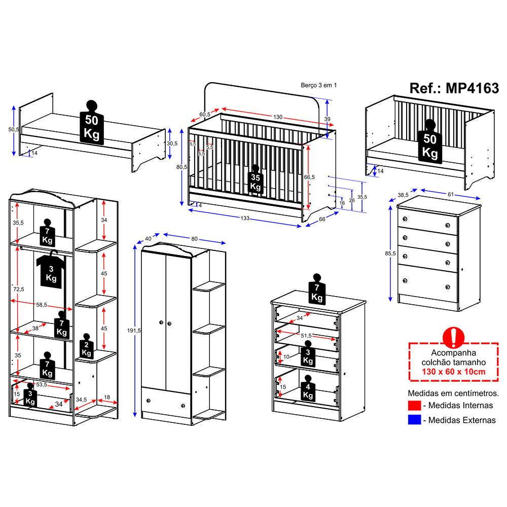 O Quarto de Bebê Completo com Berço 3 em 1 com Colchão Multimóveis MP4163 é a escolha perfeita para um ambiente estiloso e confortável para o bebê. Produzido em MDP com acabamento acetinado (cerca de 20% de brilho), garante durabilidade e resistência. O berço se transforma em sofá e minicama, acompanhando o crescimento do seu filho, possui 3 regulagens de altura para o colchão e acompanha suporte para mosquiteiro, garantindo noites mais tranquilas de sono para o bebê. A grade Soft (PVC) é produzida de maneira ecologicamente correta, com matéria-prima livre de metais pesados, atóxica e com proteção anti-amarelamento. Berço certificado pelo INMETRO sob o selo n° 0000085/2018. O colchão possui estrutura em espuma e tecido poliéster. De conforto macio, possui tratamento anti-ácaro e anti-alérgico e é indicado para até 50kg. Com amplo espaço interno, o guarda-roupas possui 2 portas e uma gaveta, além de 4 prateleiras externas. A cômoda conta com 4 gavetas espaçosas e sistema anti-tombamento. A cômoda e o guarda-roupas possuem puxadores em ABS, corrediças metálicas (que oferecem leveza no manuseio) e ainda acompanham detalhes em 4 cores (Branco, Rosa, Azul e Cinza), permitindo que você escolha qual combina mais com sua decoração na hora da montagem. Conteúdo da Embalagem: 1 (um) Berço 1 (um) Colchão 1 (um) Guarda-Roupas 1 (uma) Cômoda Kit Ferragem Manual de Montagem Dimensões do produto montado: Berço - Altura: 80,5cm | Largura: 133cm | Profundidade: 66cm Colchão - Altura: 10cm | Largura: 130cm | Profundidade: 60cm Guarda-Roupas - Altura: 191,5cm | Largura: 80cm | Profundidade: 40cm Cômoda - Altura: 85,5cm | Largura: 61cm | Profundidade: 38,5cm *Você pode consultar as medidas detalhadas na imagem técnica do produto. *As cores do produto podem sofrer variações de tonalidade de acordo com as configurações do seu dispositivo. Imagem meramente ilustrativa. Decoração não acompanha o produto. O produto será entregue desmontado e não disponibilizamos o serviço de montagem.